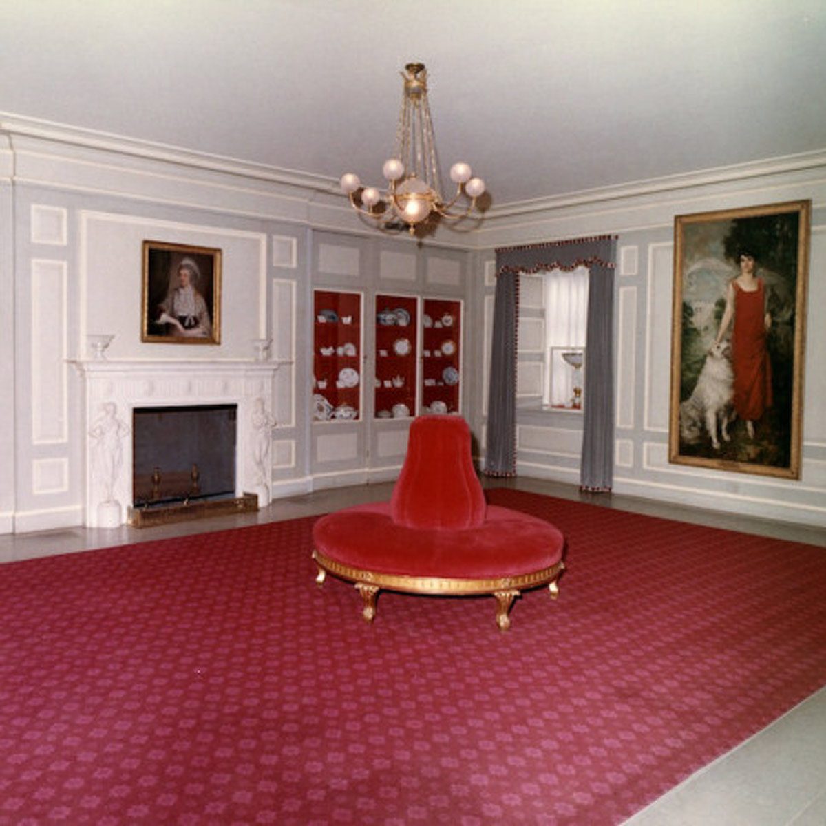 While the Kennedys were in the White House it was used as a drawing room. Jackie had it painting a soft yellow and brought in a pale yellow oval carpet. Oriental rugs topped the carpet. Sister Parish designed the room initially and then Boudin added some touches to it. Boudin replaced the furniture with French antiques from the 18th and 19th centuries in the Louis XVI style. Two green marble columns were made to hold antique, electrified candelabras.