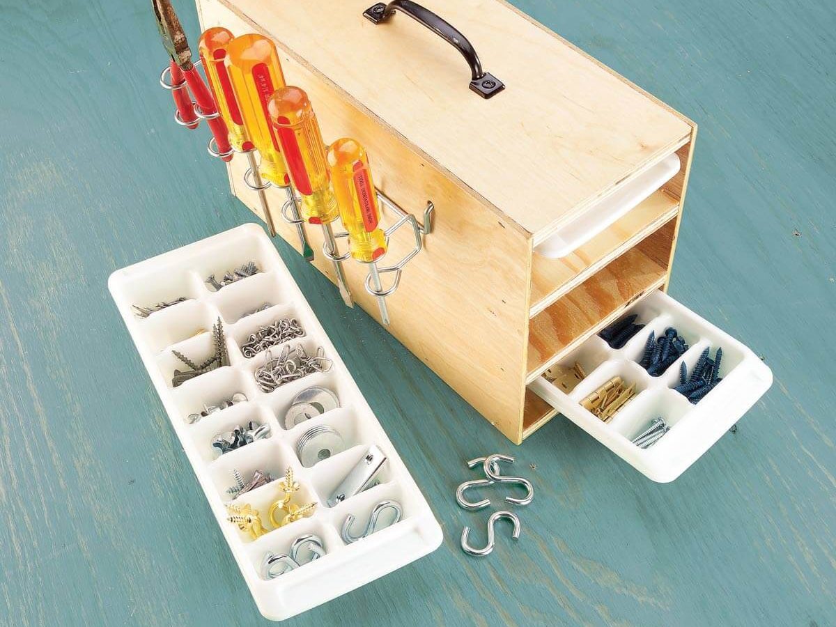 It might be time to upgrade the old coffee can filled with your lifetime collection of screws, washers and other hardware. Take 10 minutes to organize the miscellany in ice cube trays. Nail together a case from scrap plywood and carry it right to the job at hand.