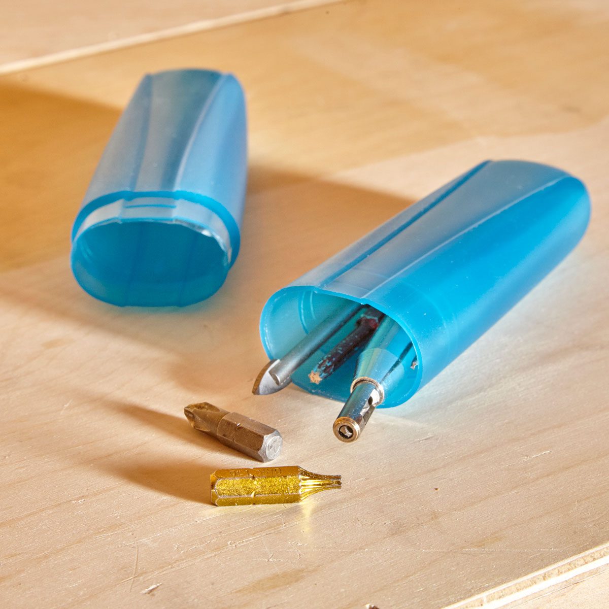 Toothbrush holders make great, inexpensive holders for drill and driver bits. You can find them at discount stores and drugstores in the sample/travel section. Label the holders with a permanent marker and keep them in your drill tote or tool pouch.