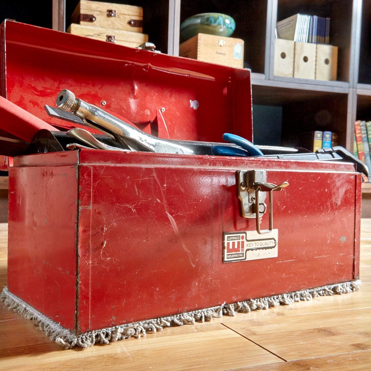 You can cut and glue a piece of carpet to the bottom of your toolbox to protect surfaces like floors and countertops from scratches. The carpet also makes it easy to slide the toolbox around rather than having to pick it up just to move it a small distance.