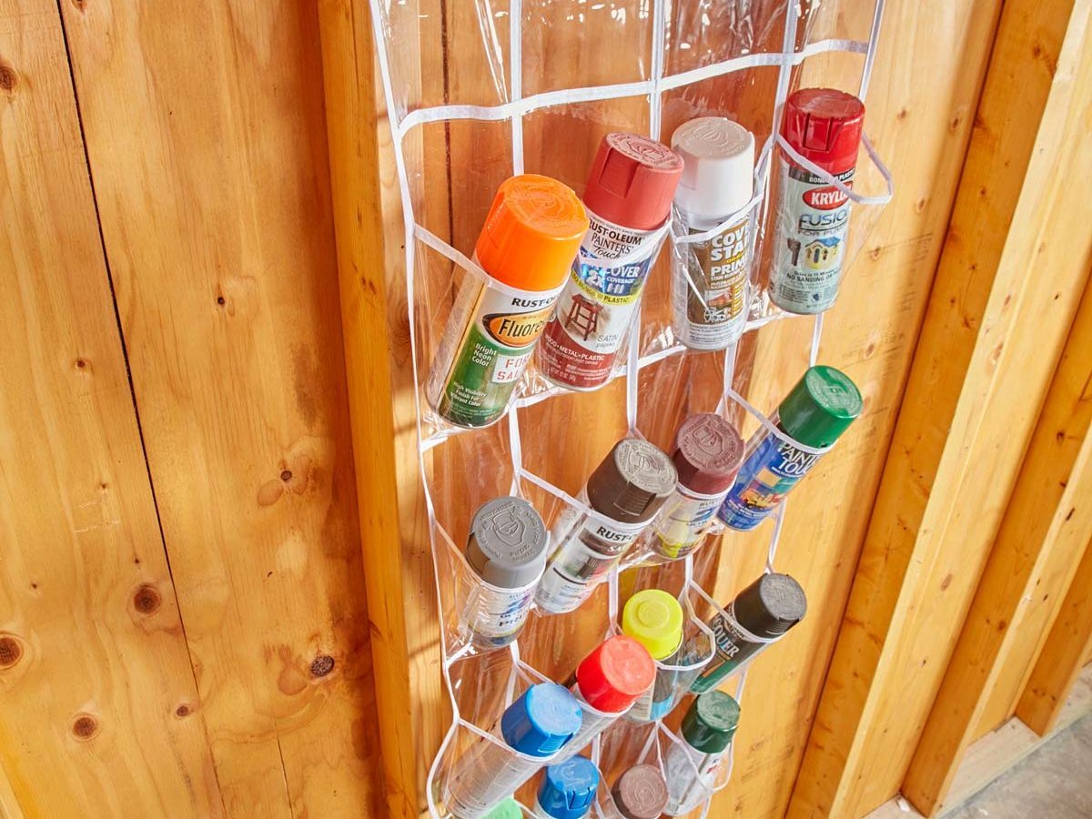 Don’t throw away that old shoe caddy! Instead, screw the shoe caddy to one of the walls in your garage and use it to store your spray paint cans. The clear storage makes it easy to quickly pick out the color you want.