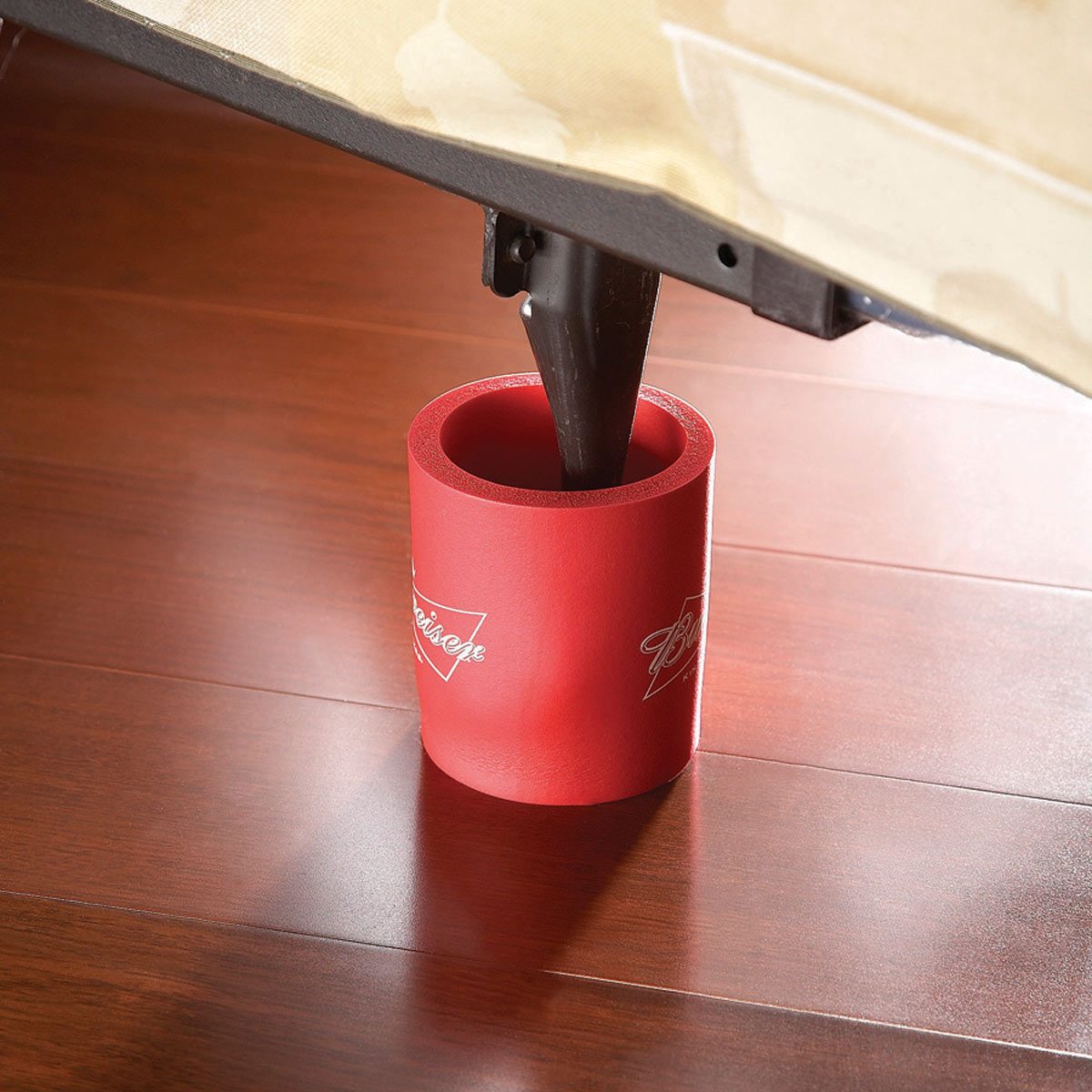How many times have you stubbed your toe on your metal bed frame? Here’s a creative way to protect your toes. Cover the bare metal leg and wheel with a foam beverage can holder. It’ll save your toes and prevent carpet dents and hardwood floor scratches to boot!