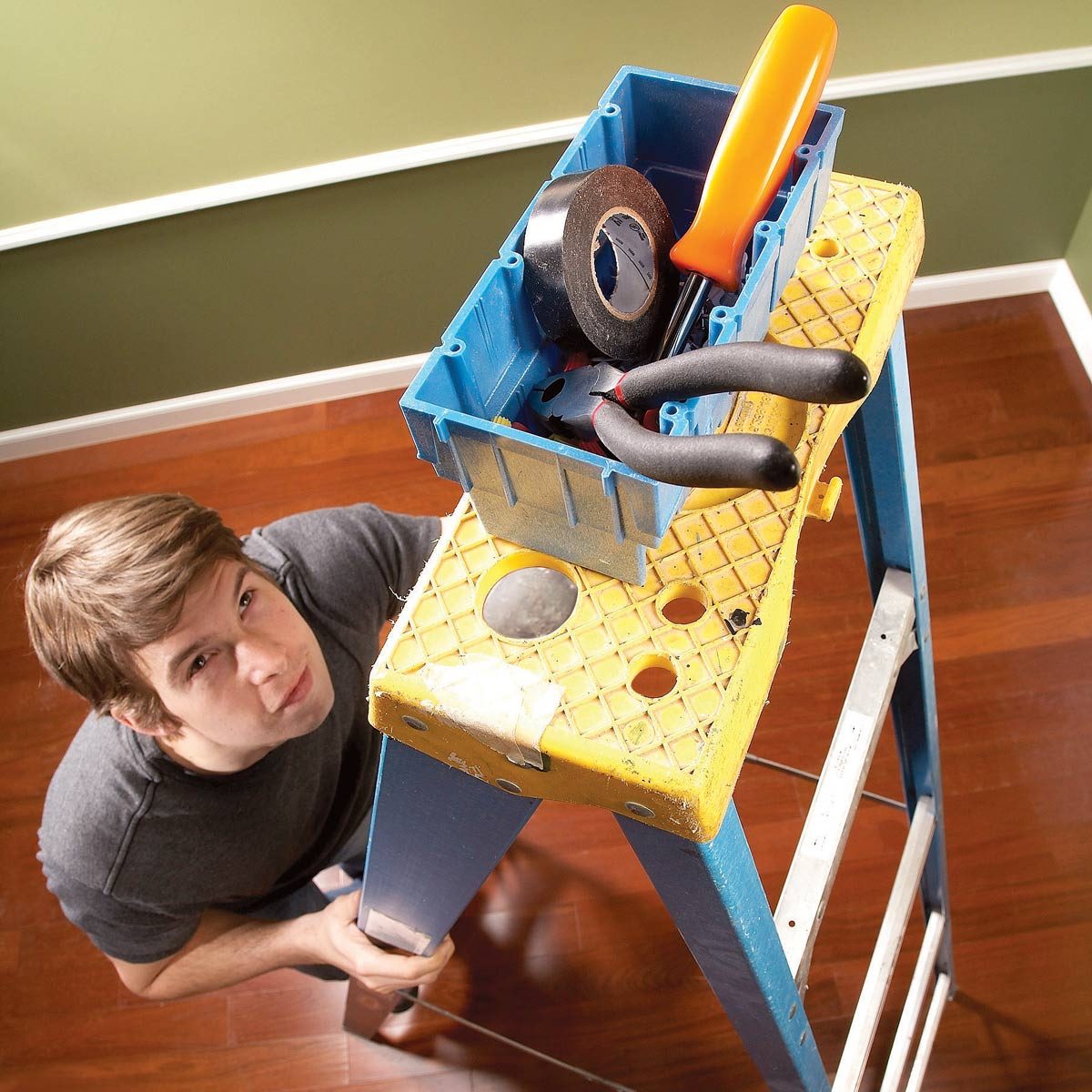 Use an electrical box to keep screws, washers, nuts and bolts handy while you’re working up on a stepladder. Bolt the electrical box to the top of the platform. Everything you need is collected in one spot and nothing rolls away.