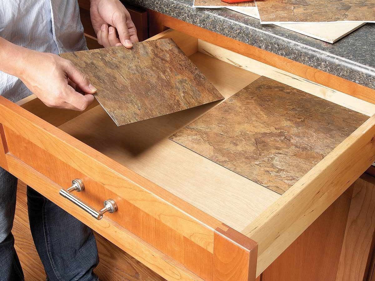Using shelf liner to line drawers or shelves is expensive and a hassle. It’s easier and cheaper to use self-stick vinyl tiles. Cut the tiles to fit with a utility knife, then peel off the backing and stick them in place.