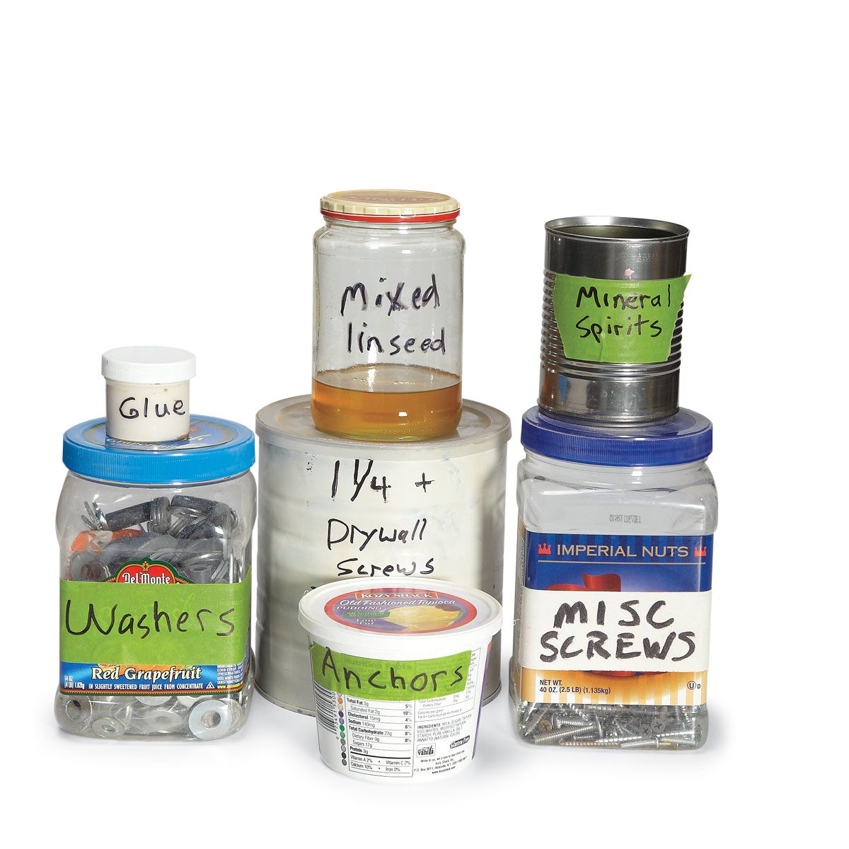 Plastic peanut butter jars work better for storage than glass baby food jars because they hold a lot more hardware and won’t break into shards if you drop one. Attach the lids of 28-oz. jars under a shelf with two screws (so the lid can’t spin when you loosen the jar) and screw on the loaded jar. For quick access, cut away half of a 64-oz. peanut butter jar with a sharp utility knife, leaving the neck intact, then attach the lid and jar to the side of a cabinet. If you load it with lemon drops, we won’t tell. Here are more workshop organization tips.