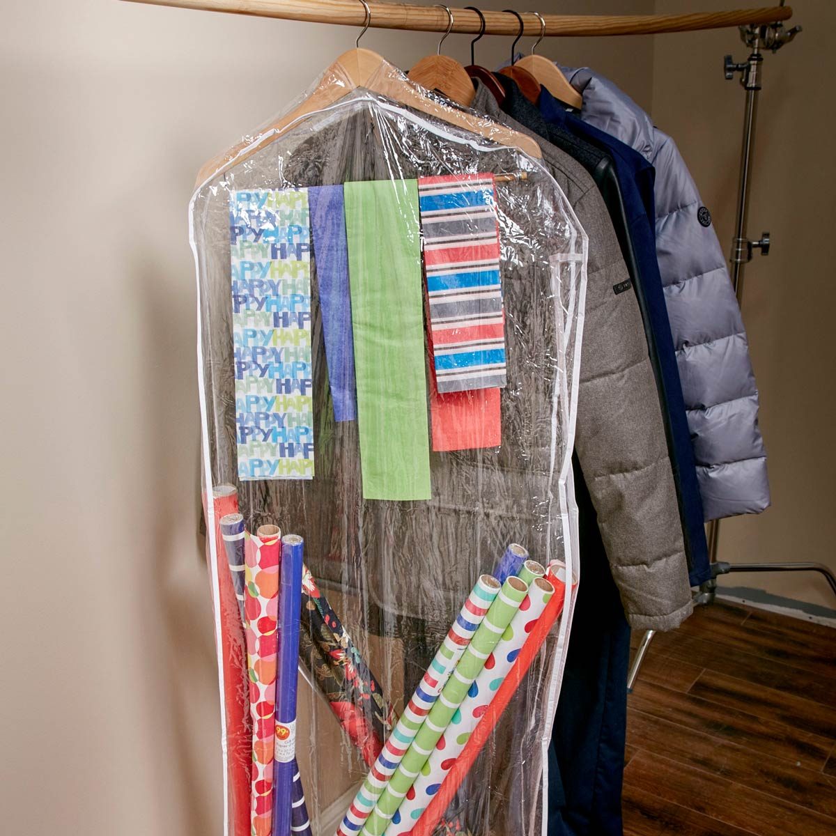 To make wrapping presents easier, use a clear garment bag as a portable gift wrap organizer. It’s great for storing all your ribbons, bows, tape and scissors — all clearly visible and grouped together. Just hang the bag in the closet until you need it, and you can carry the whole shebang to the dining room table whenever you have a big wrapping project.