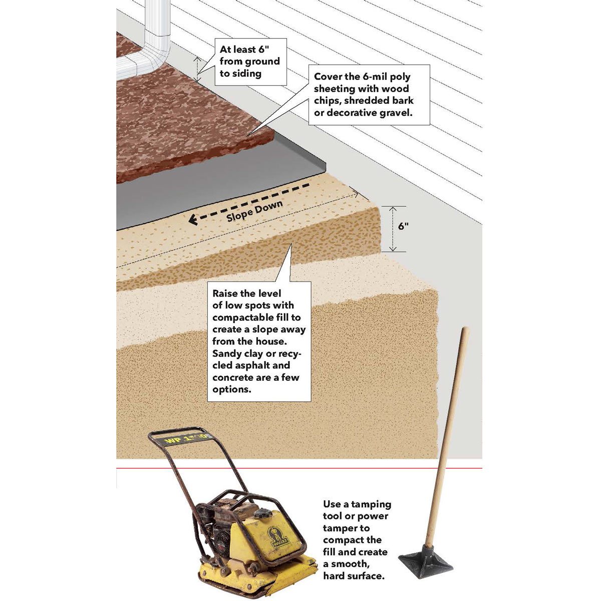 Solve the problem by creating a six foot wide slope that drops about six inches away from the foundation. Cover the sloping soil with a layer of 6-mil poly. Then hide the poly with mulch, gravel or a layer of soil covered with grass. This will keep water from soaking in near the foundation.
