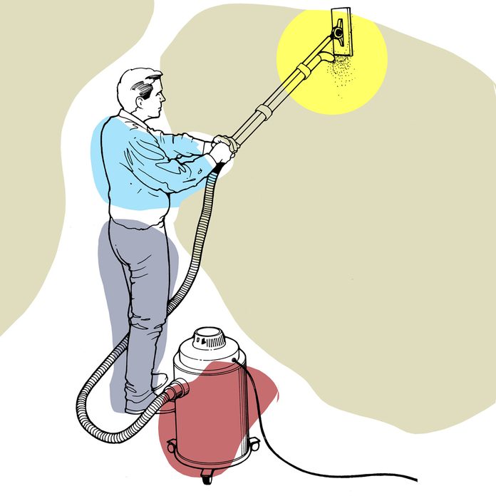 Here’s a way to keep dust to a minimum when you have a lot of drywall compound to sand. Using duct tape, attach a standard swivel-head drywall pole sander to the rigid extension tube of your wet/dry shop vacuum. Keep the vacuum nozzle close to the sandpaper, and just below it. You’ll also need an extra length of hose for your vacuum to reach the ceiling and into corners. — Bruce Wallick