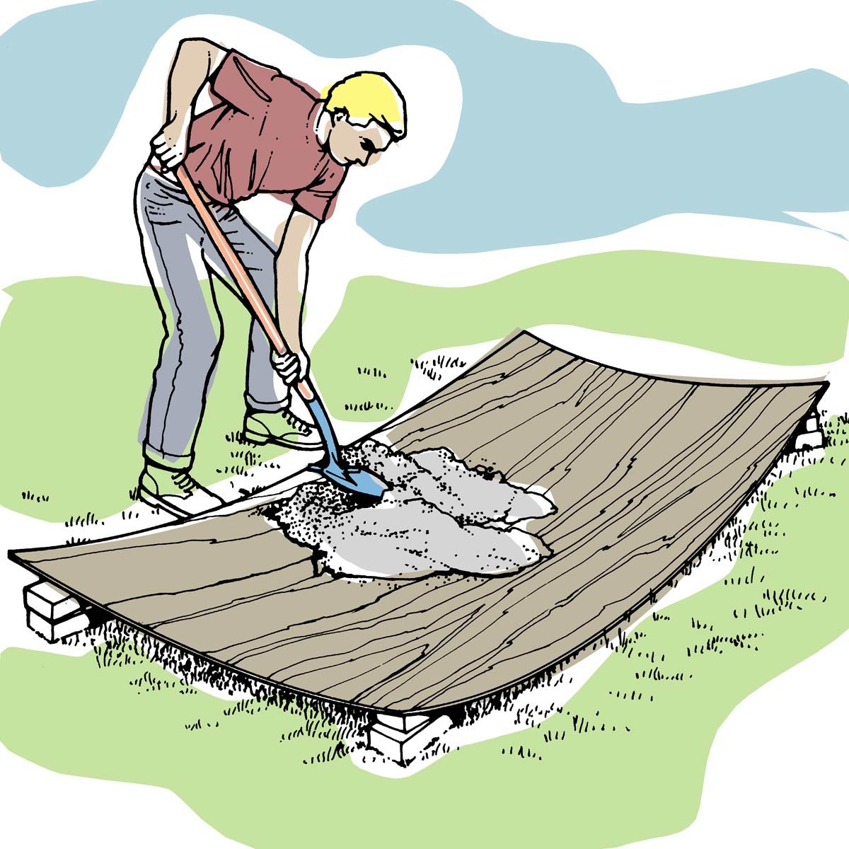 If you have a batch of concrete to mix, but nothing to mix it in, use a 4 x 8-foot sheet of 1/4- or 3/8-inch plywood. Place a few bricks or scraps of 2×4 under all four of the plywood corners to form a shallow, concave mixing tub. Clean the concrete off thoroughly, and when you’re finished, you can still use the plywood with the other side up. — John Gandolfo