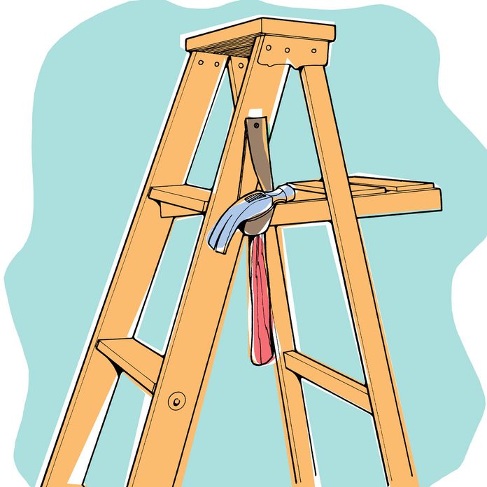 How many times has your hammer fallen off the top step of the stepladder and you had to climb down to get it? With a piece of old leather belt or canvas strap, and a 3/4-inch long screw, you can fix the problem for good. — Lin George