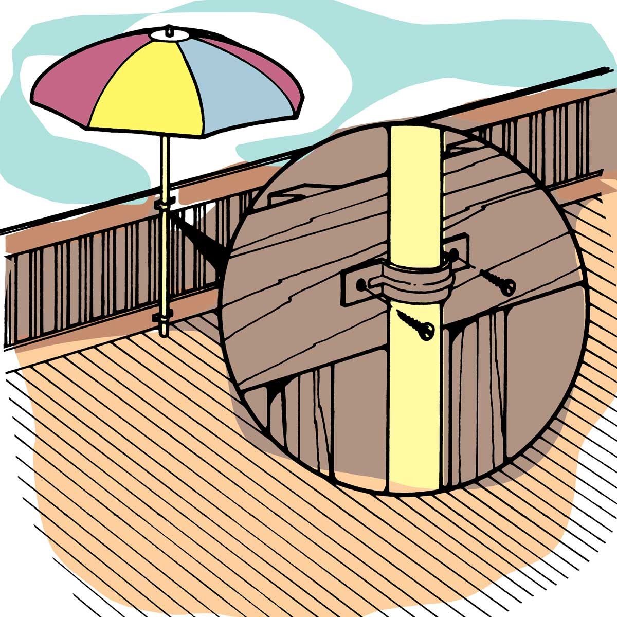 Does your deck umbrella always seem to be in the wrong spot to shade you from the sun? Mount several sets of galvanized plumbing pipe straps on the deck posts or railing in key places. Use straps with a slightly wider diameter than the umbrella pole. Then just pick a spot and slip the umbrella pole through the straps until the bottom of the pole rests on the deck. You’ll get shade right where you need it.