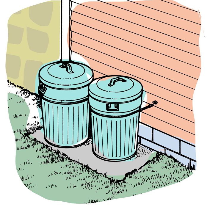 There really is a simple way to keep those garbage cans from getting blown over or dumped. For each garbage can, all you need are two 3/4-in. screw eyes and a 30-in. hook-end Bungee cord from the hardware store to keep them in their place.