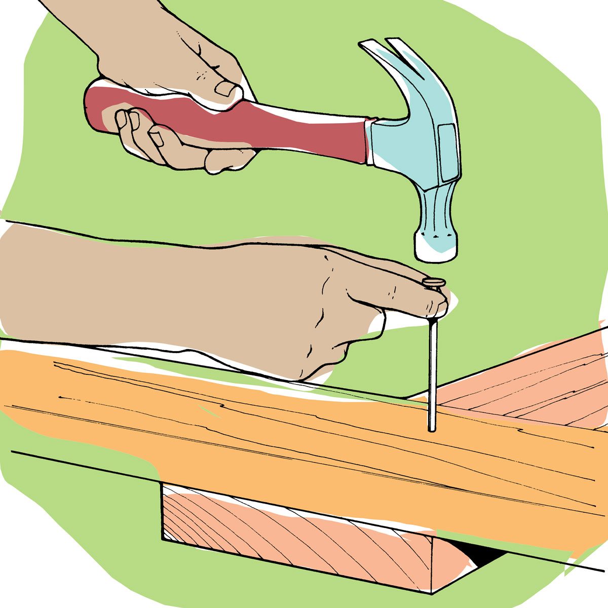 Here’s a way to avoid blue thumbnail misery when you make an occasional bad swing with a hammer: When starting a nail, hold it with your thumb and forefinger right under the head rather than lower down. You’ll be able to keep your eye on your thumb as well as the nailhead, giving you better aim. And if you do make a bad swing, your thumb and finger are more likely to be deflected by the hammer than squashed.