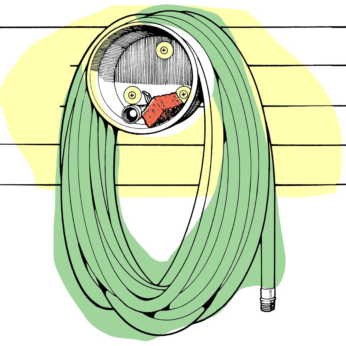 An easy way to make a sturdy garden hose hanger: Attach a large plastic pail to the wall with large flat washers and drywall screws at least 2-inches long. Store the hose accessories inside the pail and loop the hose over the outside.