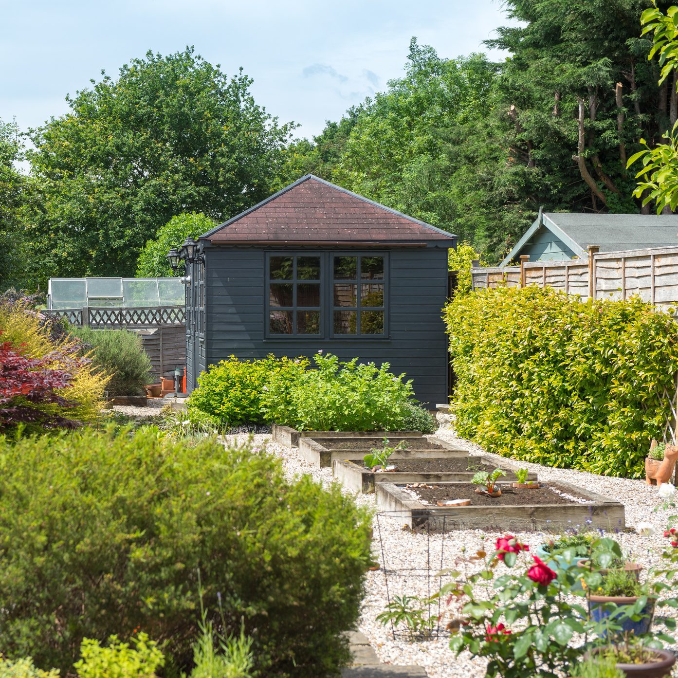 A potting shed offers protection from the sun, rain and wind so you can garden any time of year.