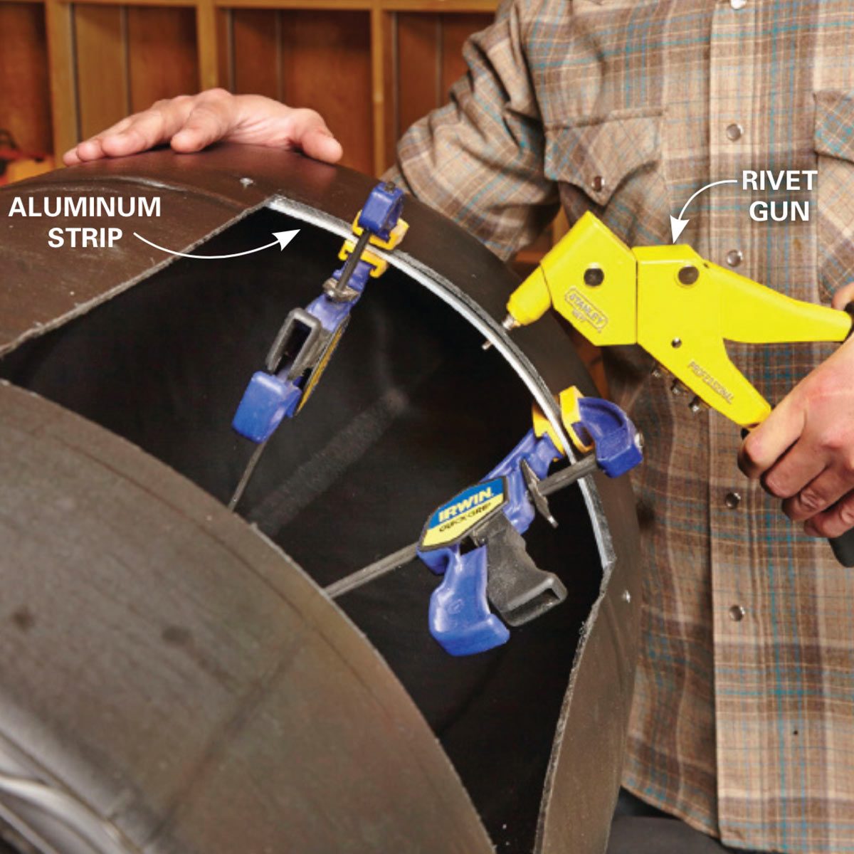 Bend 1/8-in. x 1-in. flat aluminum stock around the drum to form side reinforcements for the door opening.