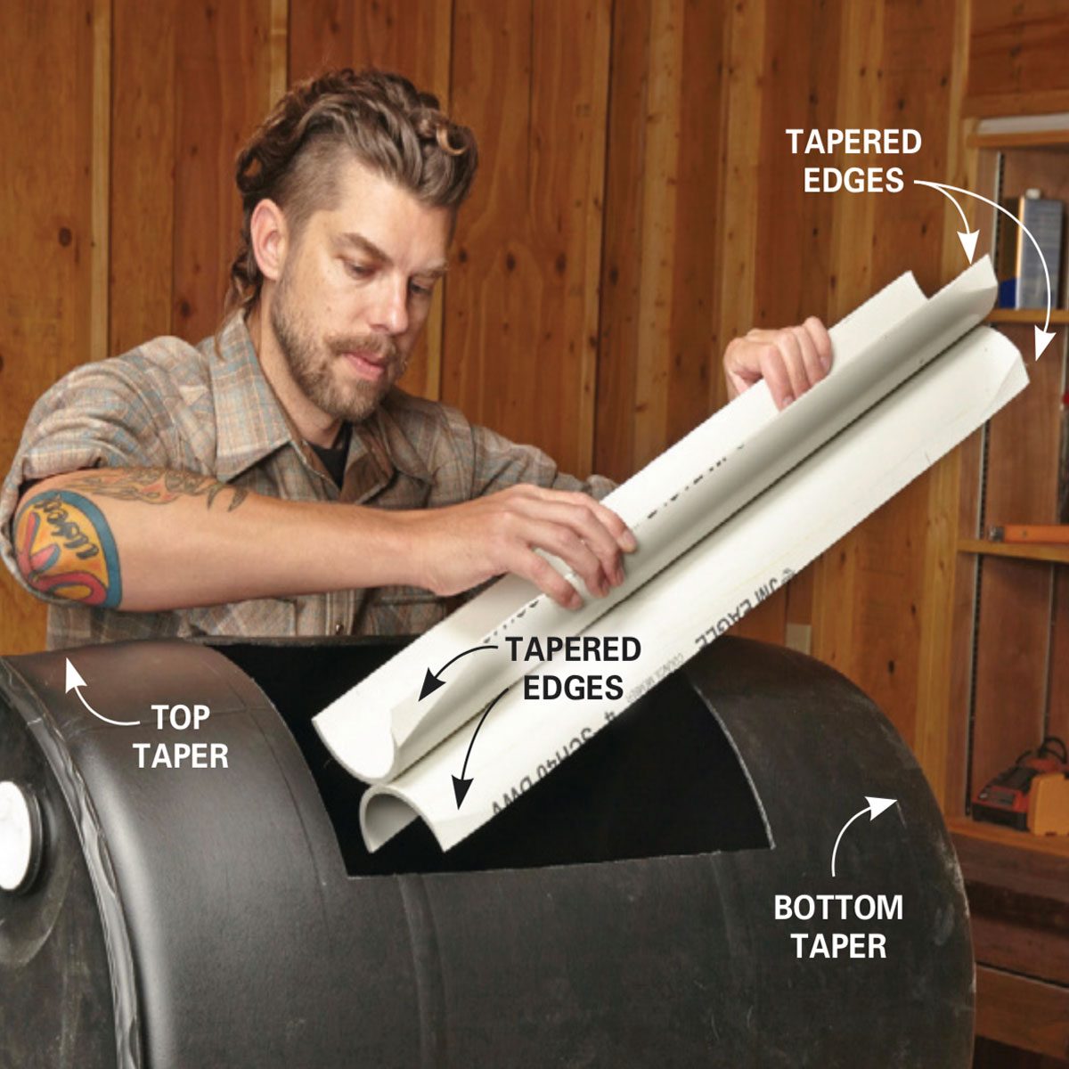 You can ask for free, used 55-gallon polyethylene drums at places like car washes, food processing plants, and industrial manufacturers. Since beggars can’t be choosers, you’ll probably wind up with a white, green, or blue drum. If that doesn’t fit your backyard color scheme (paint doesn’t stick well to polyethylene), contact a container company and order the color you want. We ordered a black ‘tight-head’ drum (which means the top is permanently sealed to the drum) for about $50 from a local supplier.