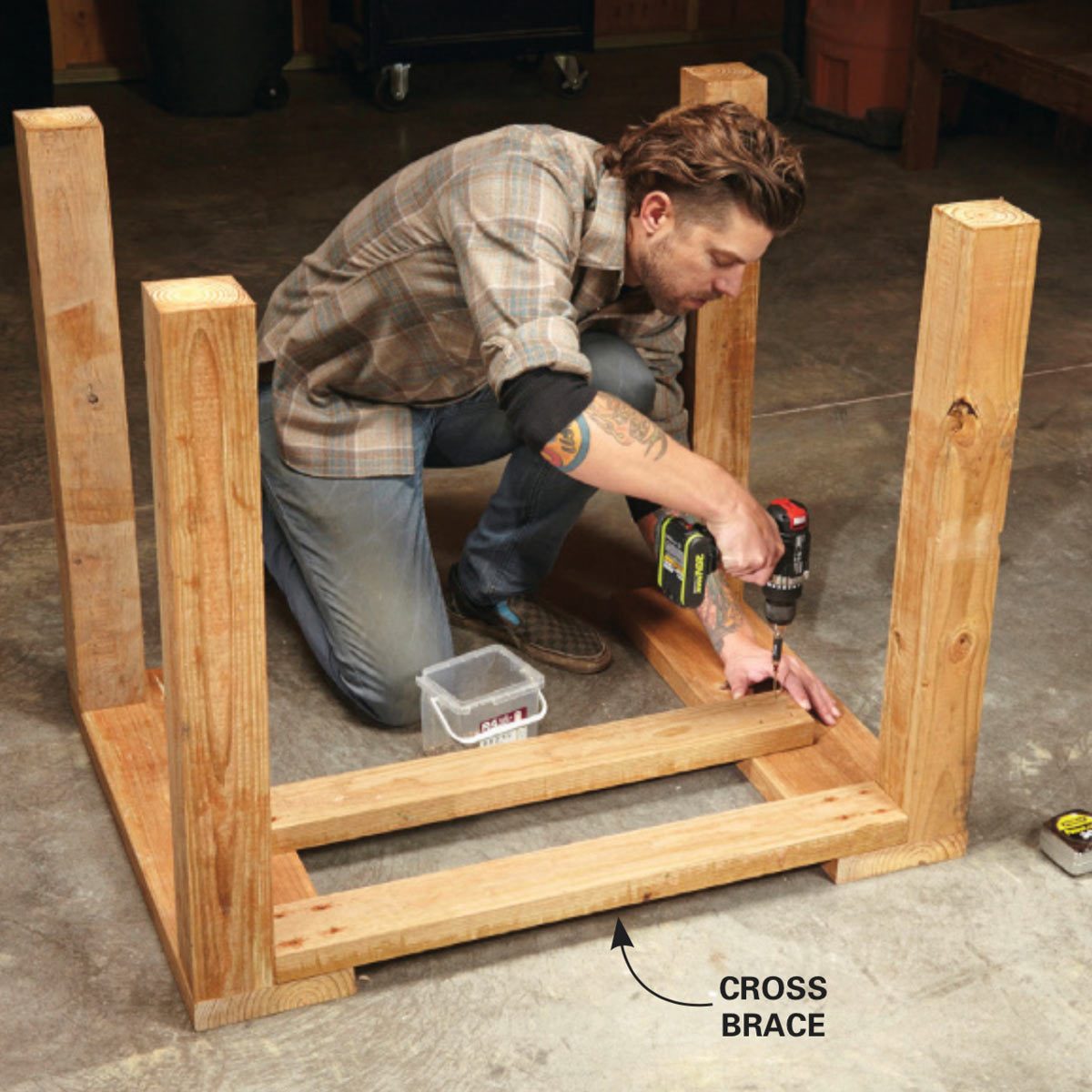 Screw the legs to the rails, then install the cross braces.