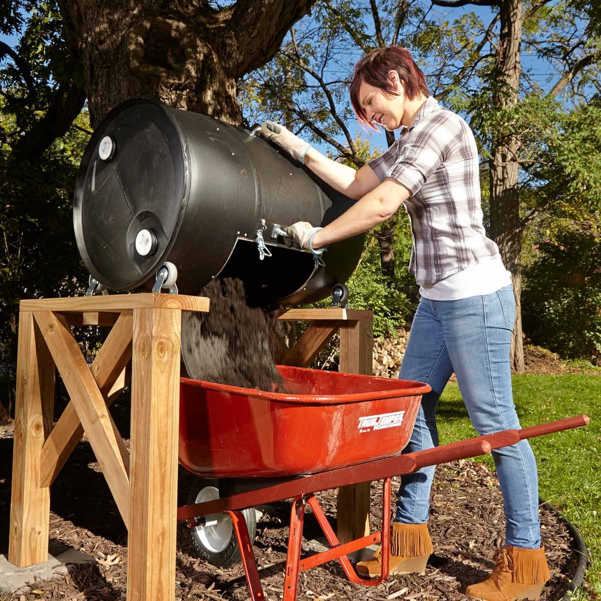Tumbling composters are an efficient way to turn waste into healthy fertilizer. Learn how to build your own from a drum barrel here.