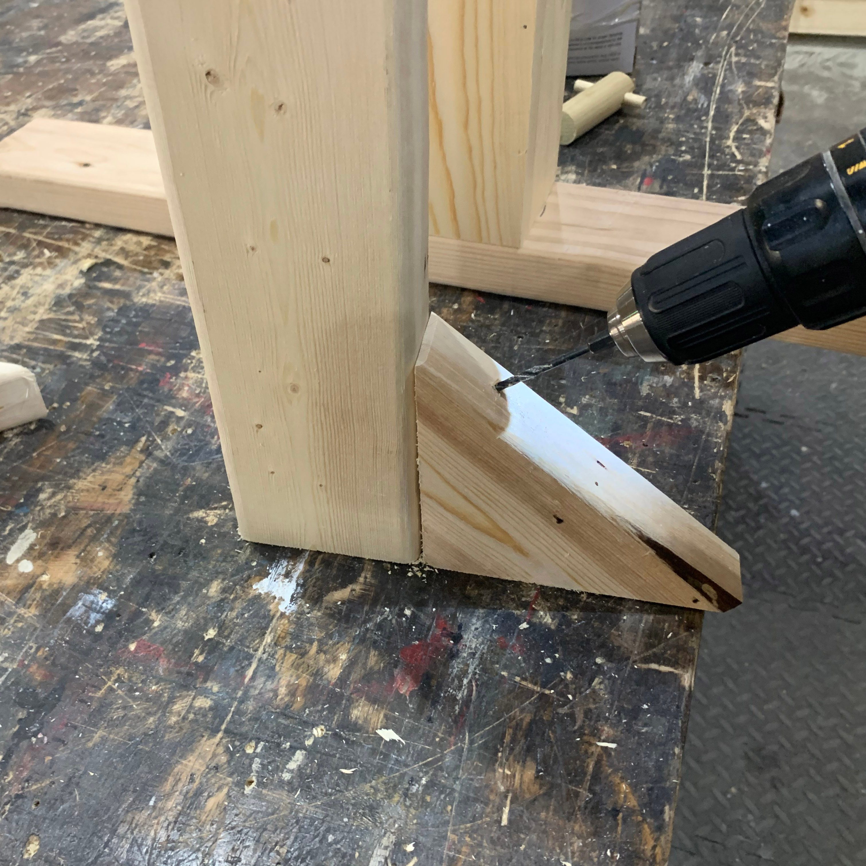 - Drill large holes for the pegs using a 1-1/4-in. spade bit