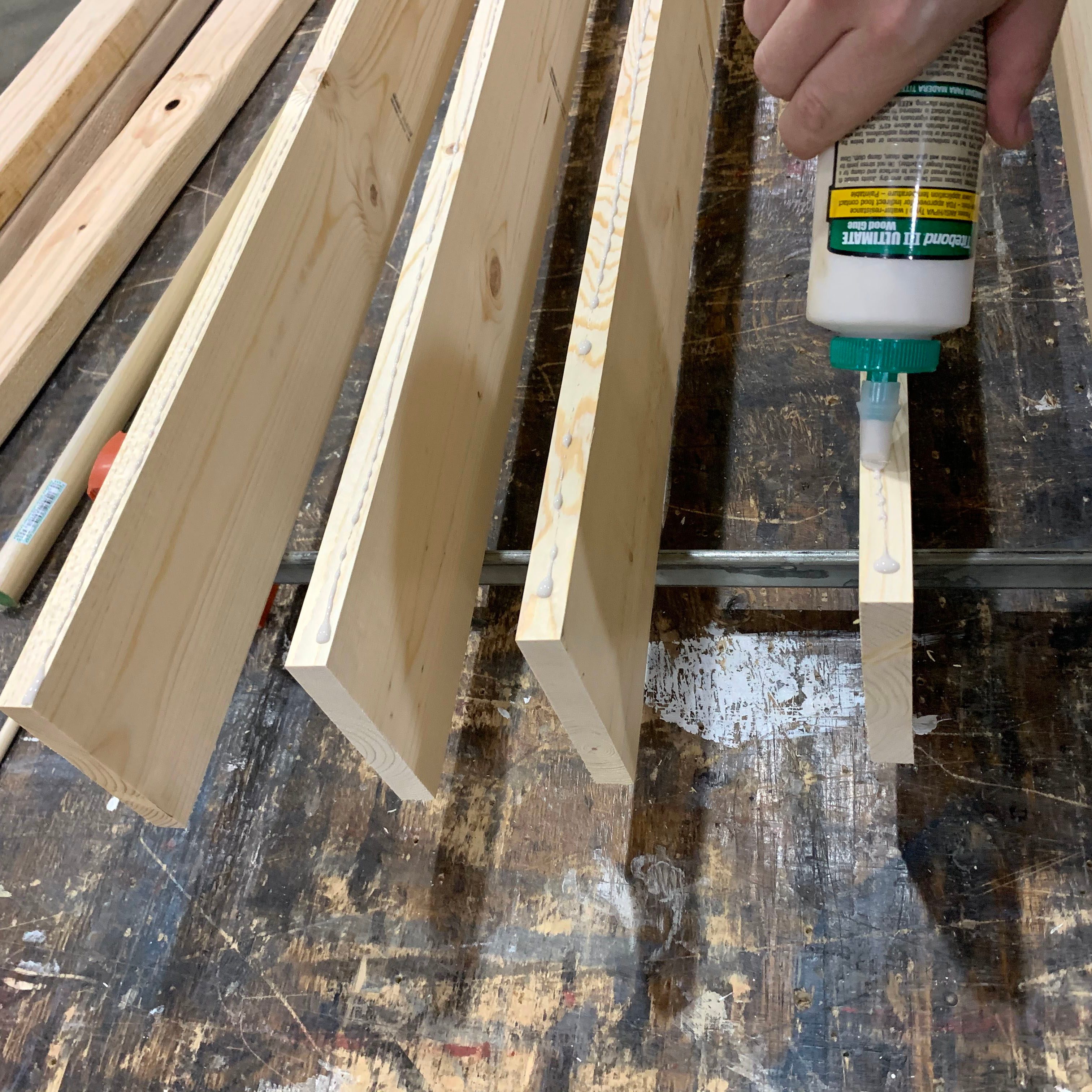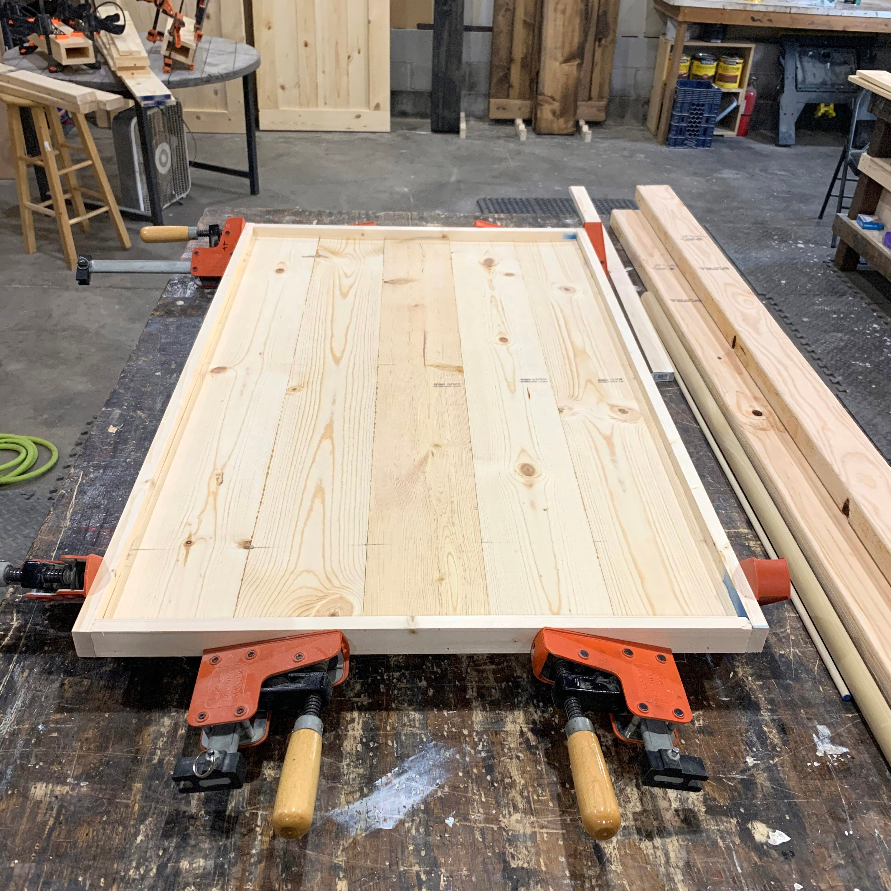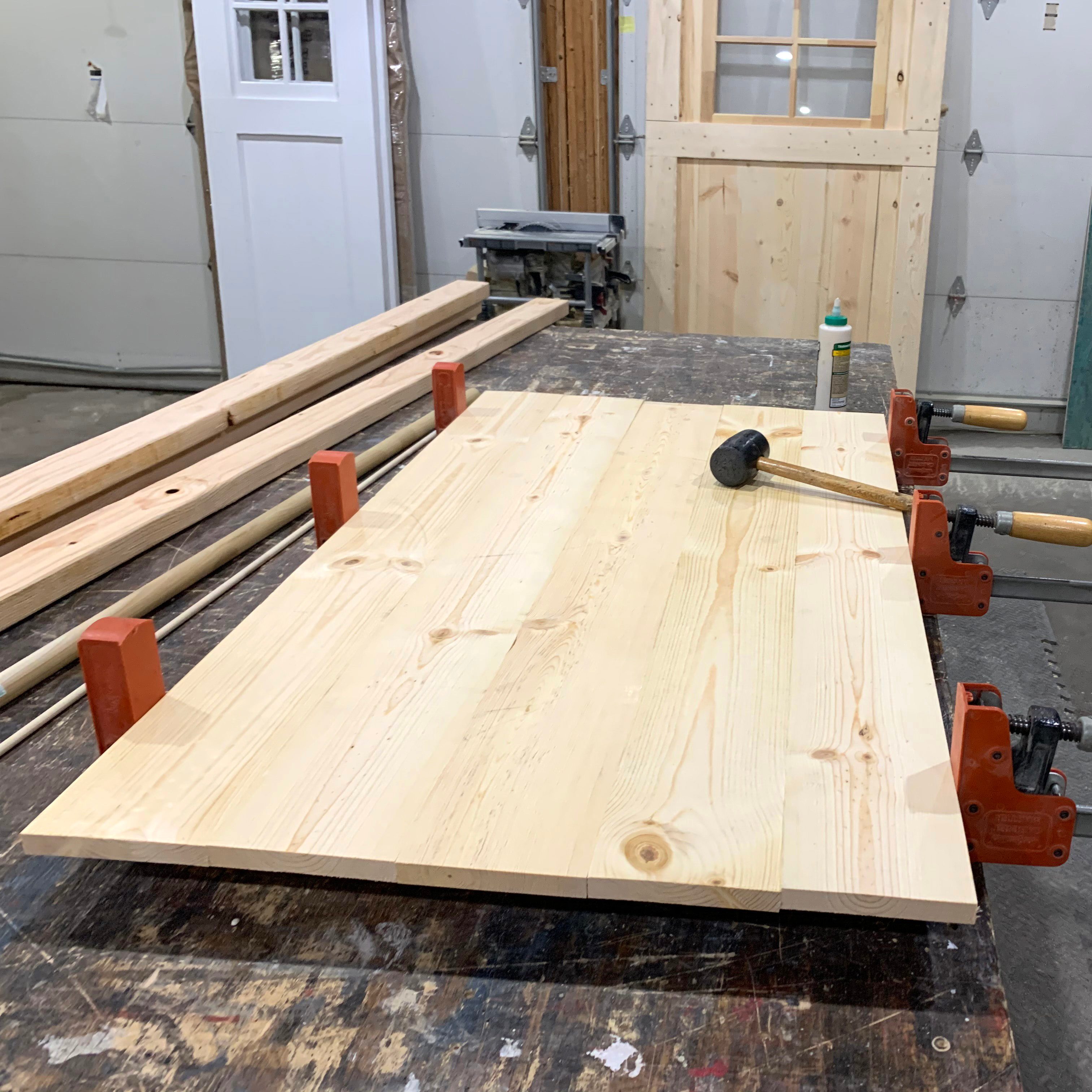 - Glue each edge and clamp five 48-in. planks edge to edge (use a mallet to hammer lightly to make them as even as possible)