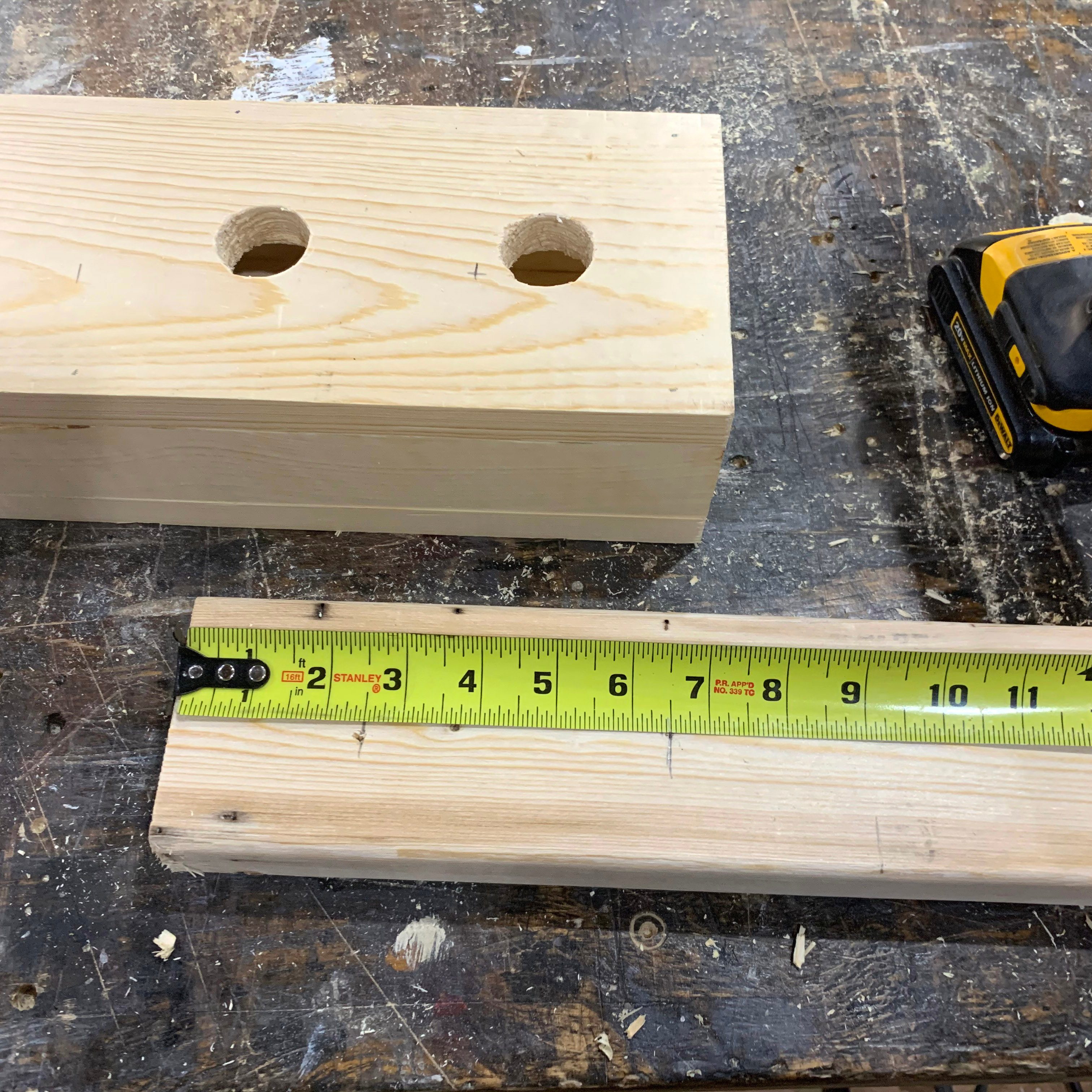 - Drill large holes for the pegs using a 1-1/4-in. spade bit