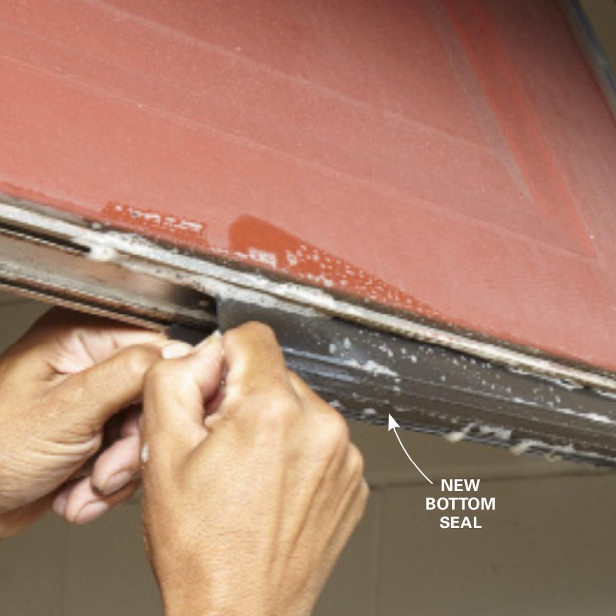 Slather some dishwashing detergent onto the slots along the bottom track or spray them with silicone. Then insert the vinyl garage door bottom seal and pull it into place. Cut off the excess vinyl with a utility knife and crimp the ends of the track with a pair of pliers.