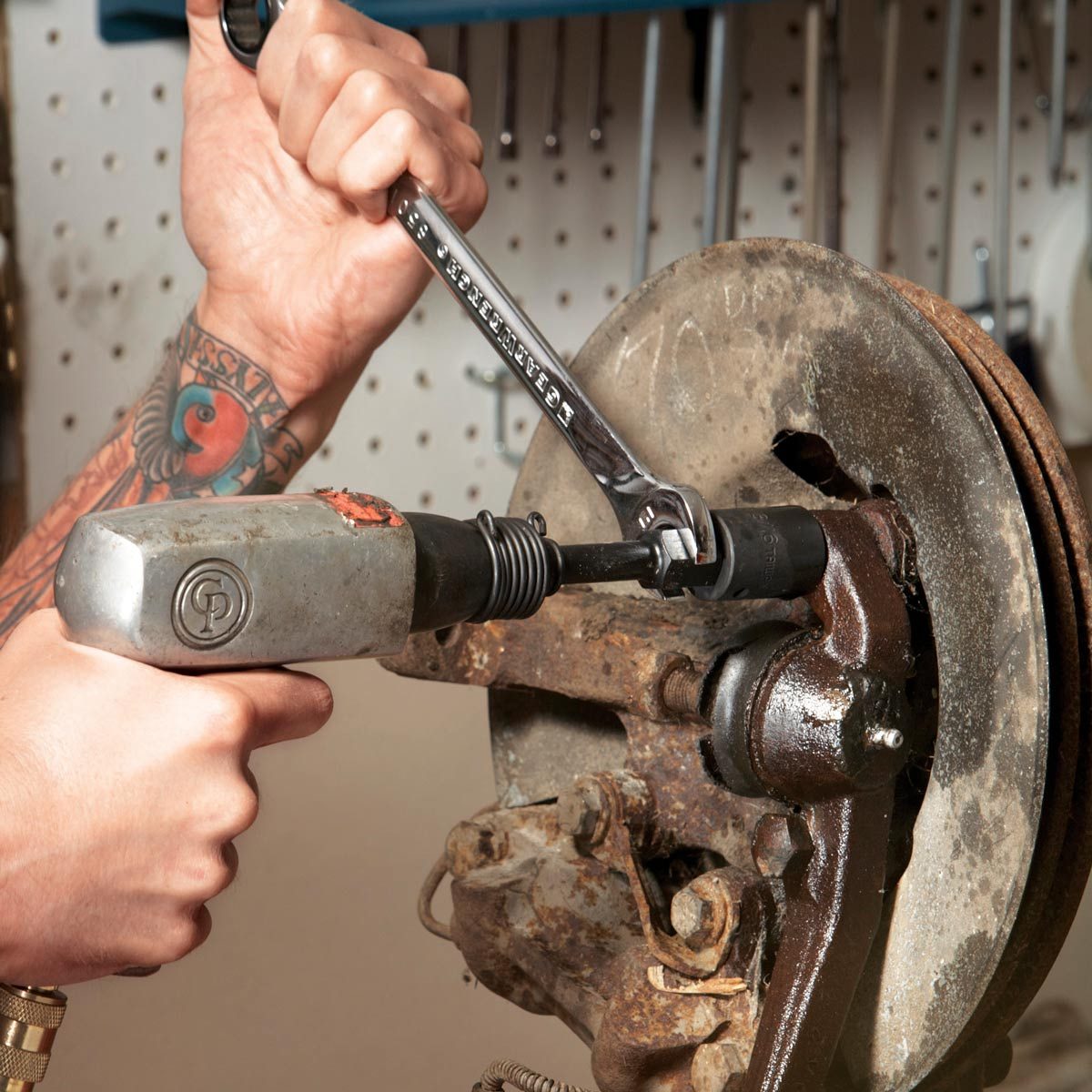 If step one fails, hit the bolts with a hammer. Create micro-cracks in the rust with blows from a ball peen hammer or an air hammer and a hammer bit (I get the best results using the latter method). Then apply more rust penetrant and “reshock” the bolt head. Repeat until you can turn the bolt.