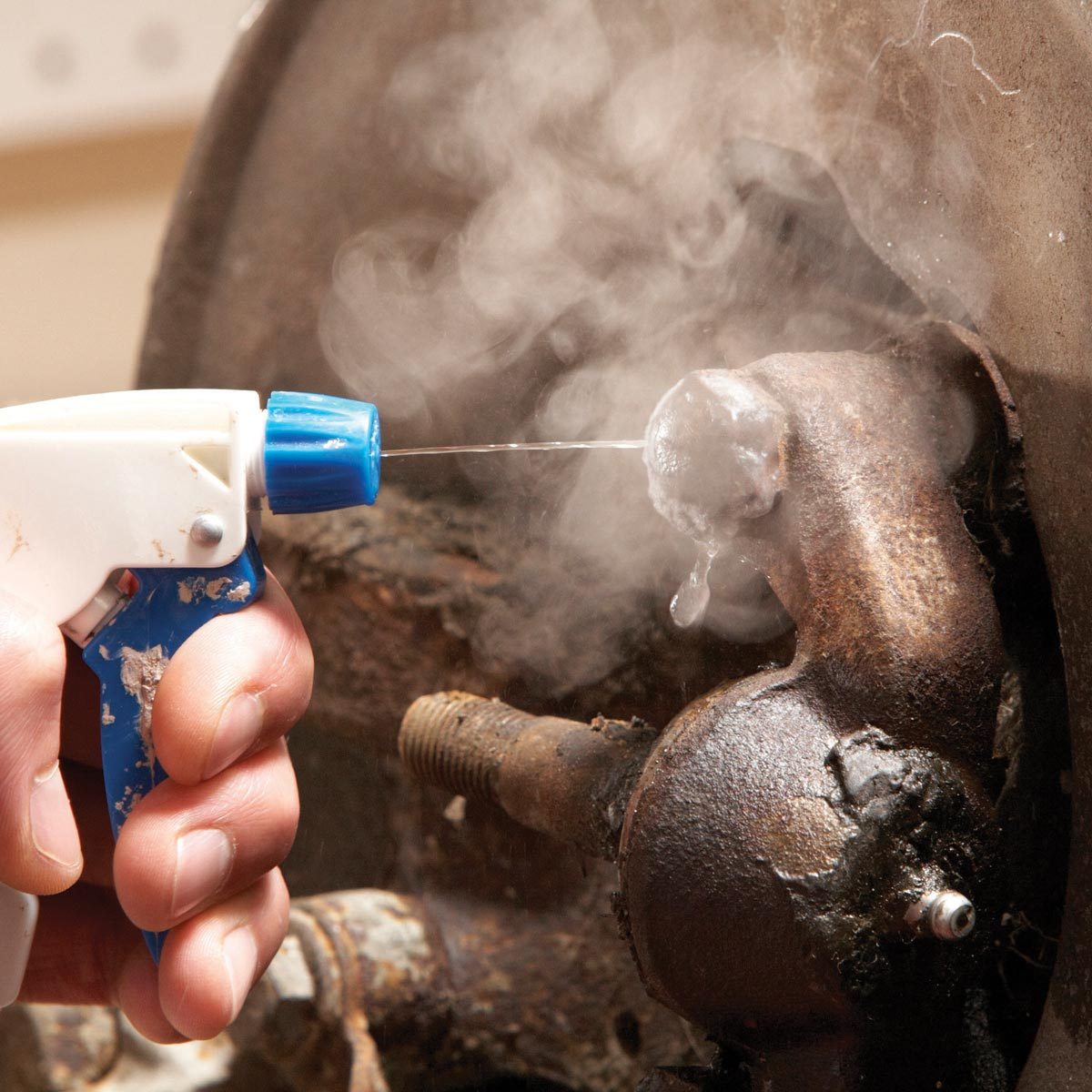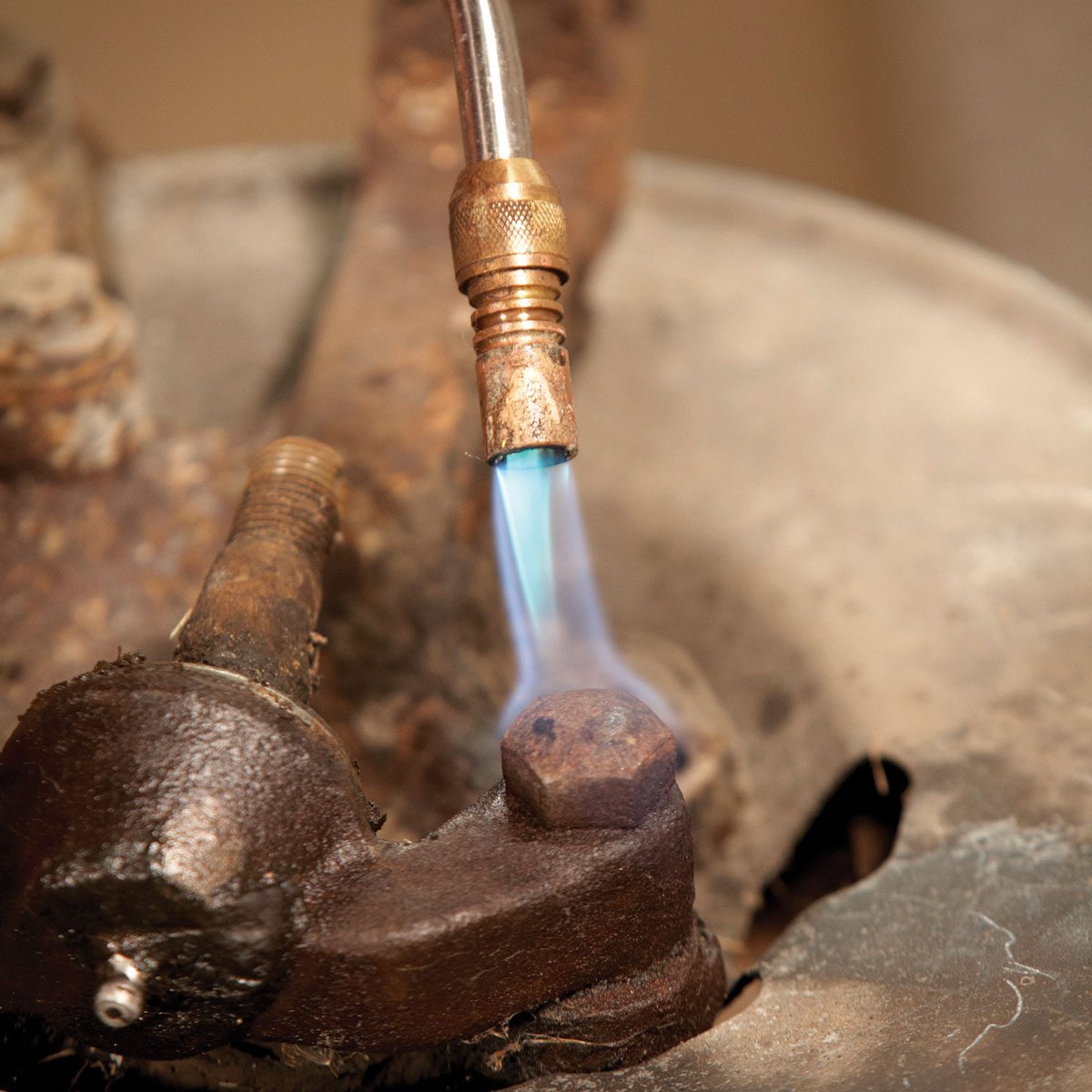 If neither trick works, heat and cool the bolt. The expansion and contraction will open cracks in the rust and allow the penetrant to work. But before you heat it, wash off the rust penetrant (most penetrants are flammable). Next, remove any rubber or plastic parts that heat may damage. Then, heat the bolt head with a propane torch. Aim the flame at the bolt head, not the surrounding metal. Heat for about 15 seconds, but do NOT get it cherry red (overheating damages the bolt’s temper, and you’d have to replace it).