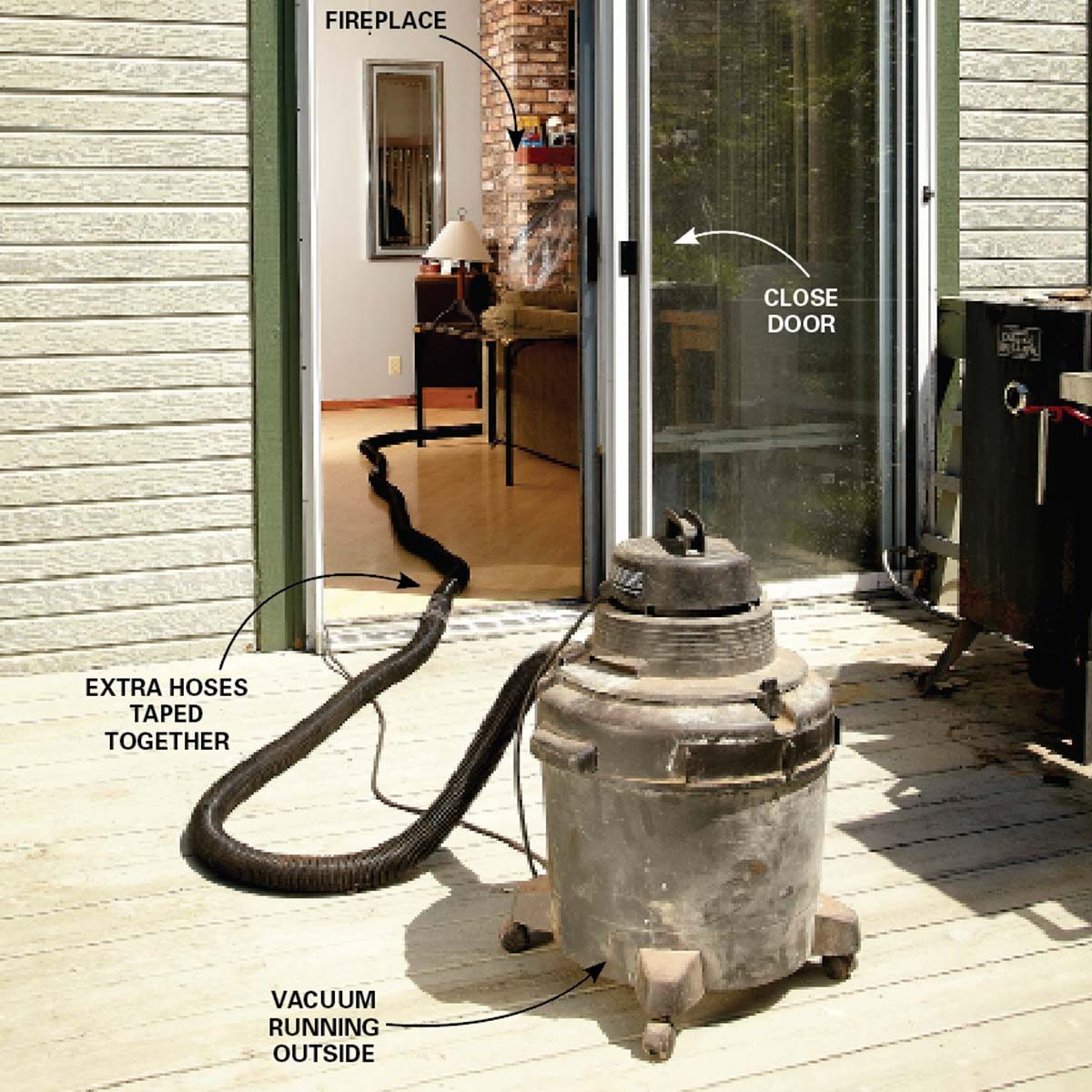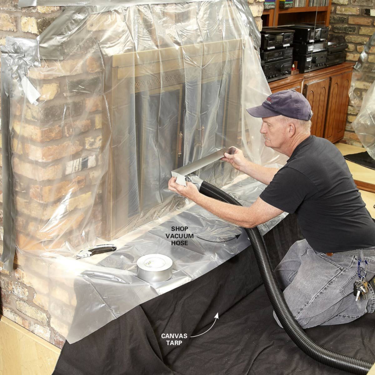 - Then tape poly sheeting over the fireplace and insert a shop vacuum hose.