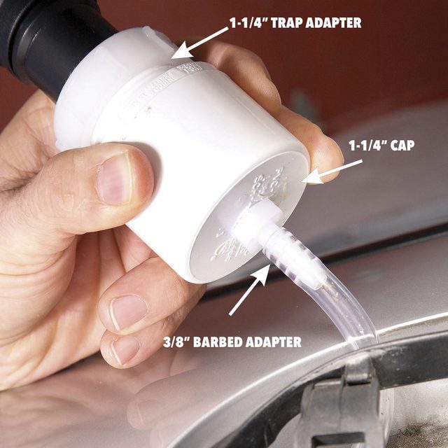 Make a hose reducer with ordinary PVC plumbing parts: you’ll need a PVC trap adapter (to fit the vacuum hose), a PVC cap (to fit the adapter), and a 3/8-in. PVC barbed adapter. Once you’ve created your hose reducer, attach a vinyl hose to the end and vacuum the crud out of the water channel and the drain tube.