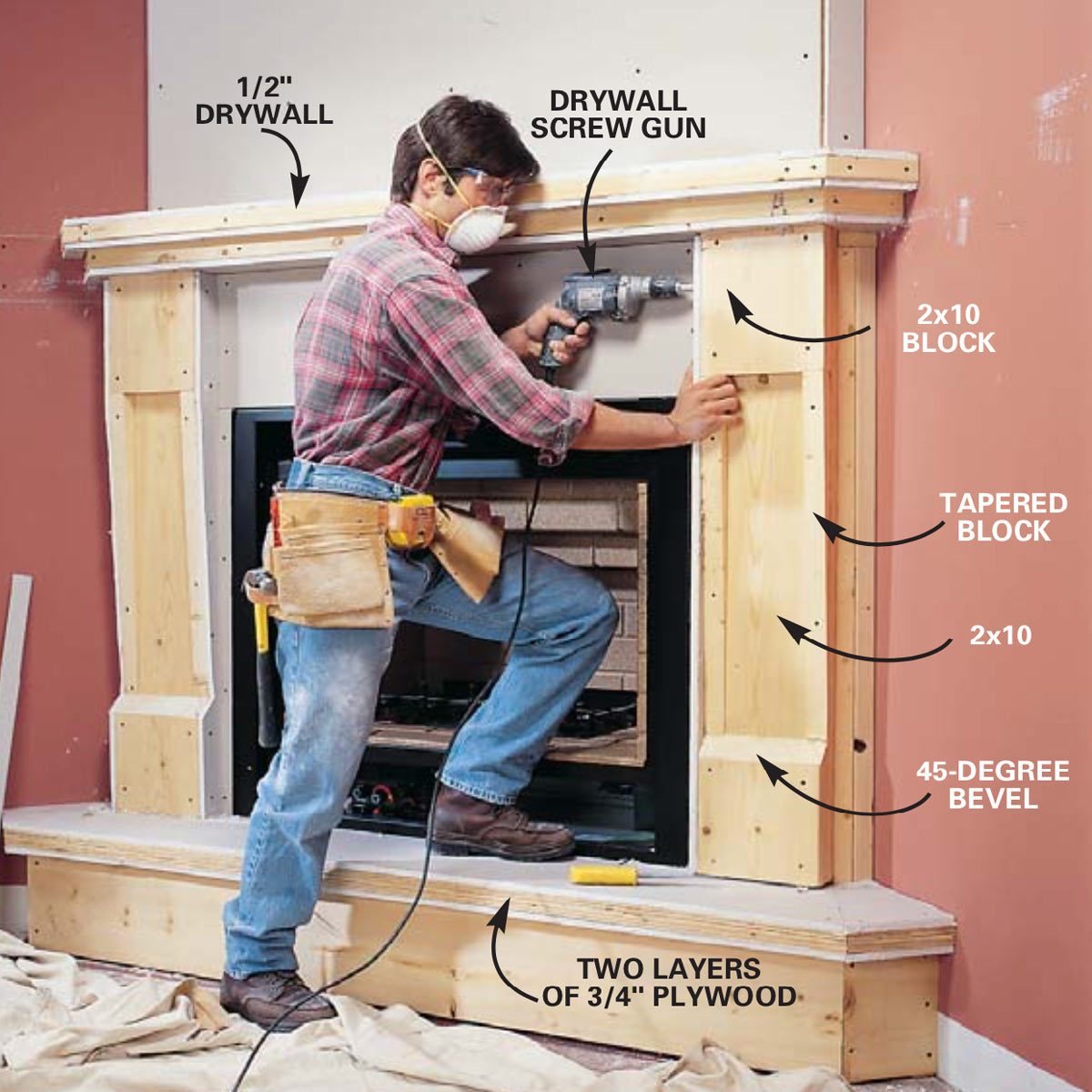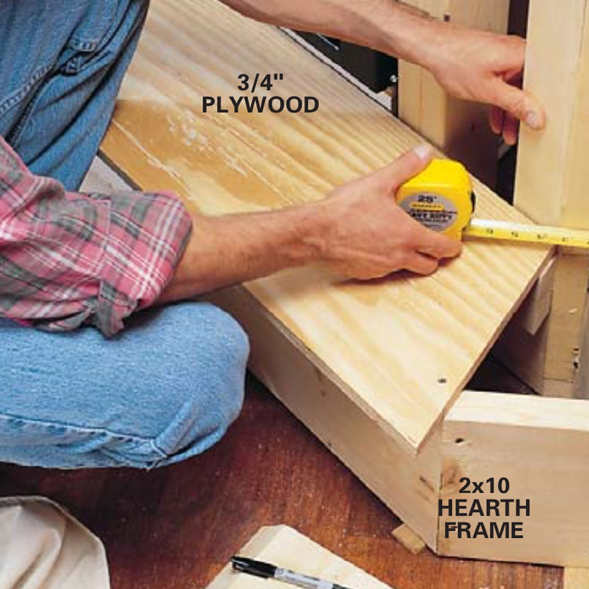 - Construct the hearth of 2x10s covered with two layers of 3/4-in. plywood.