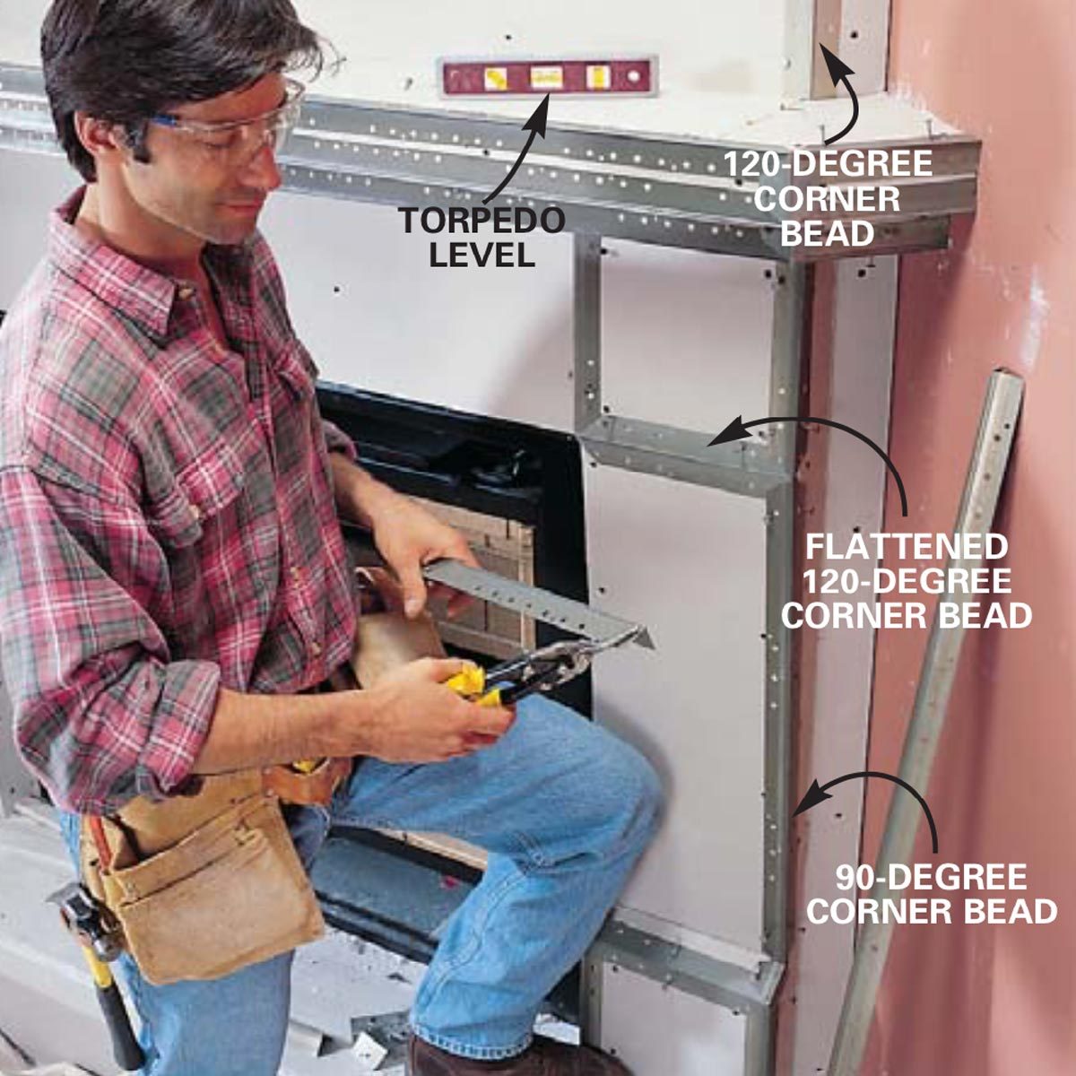 - Cover all the outside corners with metal drywall corner bead. Where two or more corner beads meet, cut angles on the ends to form a point.