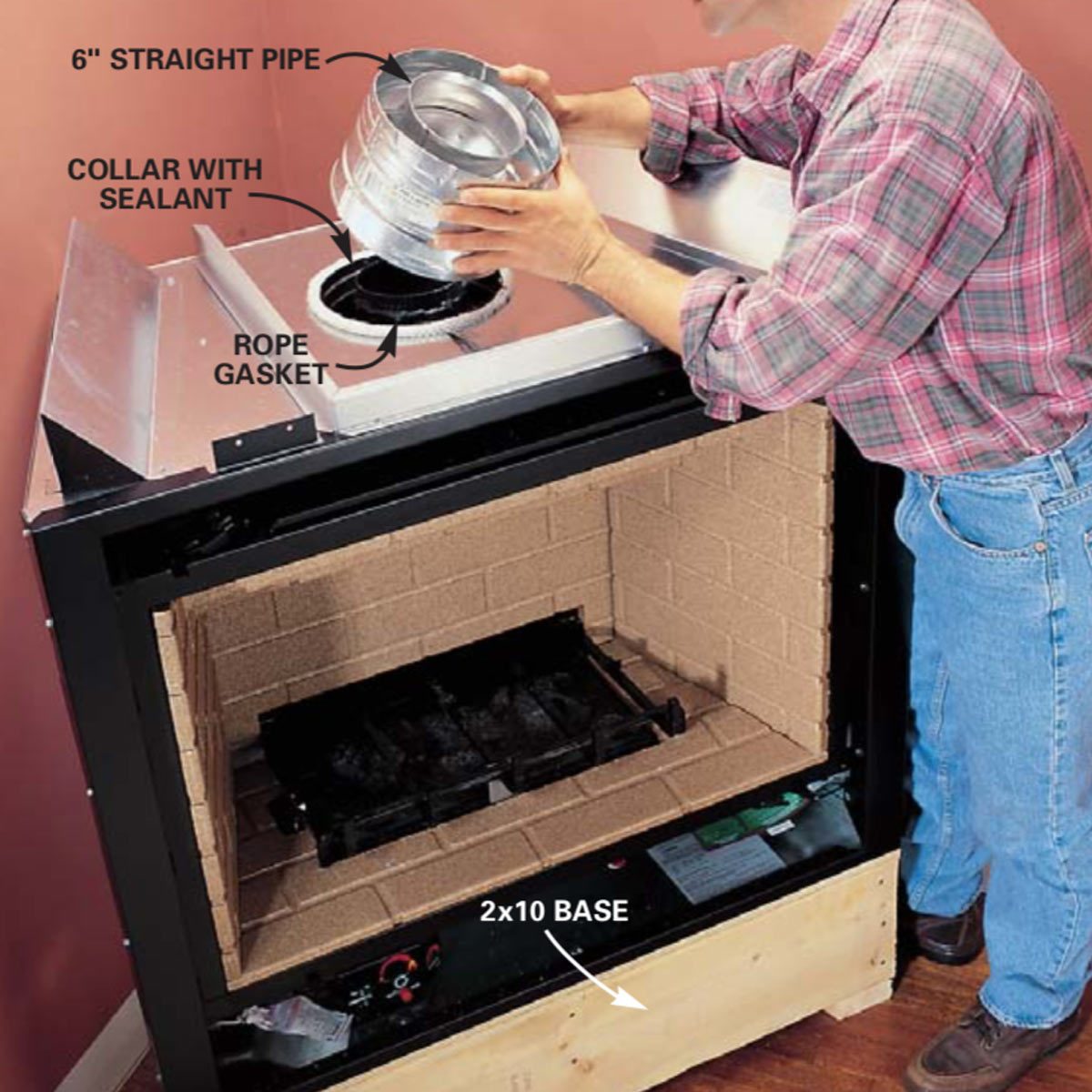 A direct-vent gas fireplace doesn’t need a chimney. Rather, you can run a special vent to the outside through an exterior wall. This process is simple and fire-safe as long as you follow the manufacturer’s directions. Be sure to read them carefully, because they might differ slightly from what we show here. For fire safety, however, make sure to heed the manufacturer’s directions on clearances for combustibles.