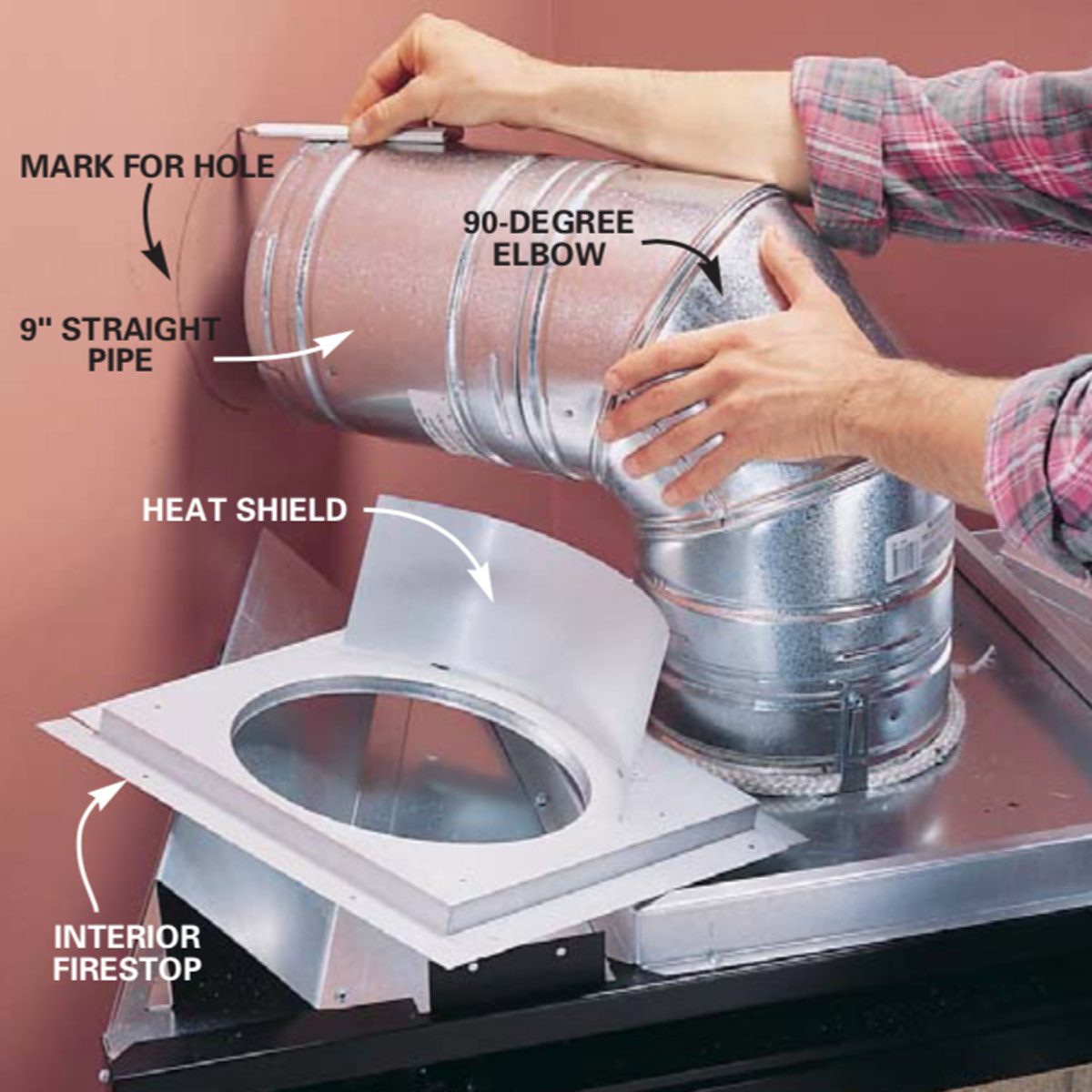 - Connect the 90-degree elbow and a 9-in. straight section to the first vent pipe. They should meet the exterior wall at a 90-degree angle.