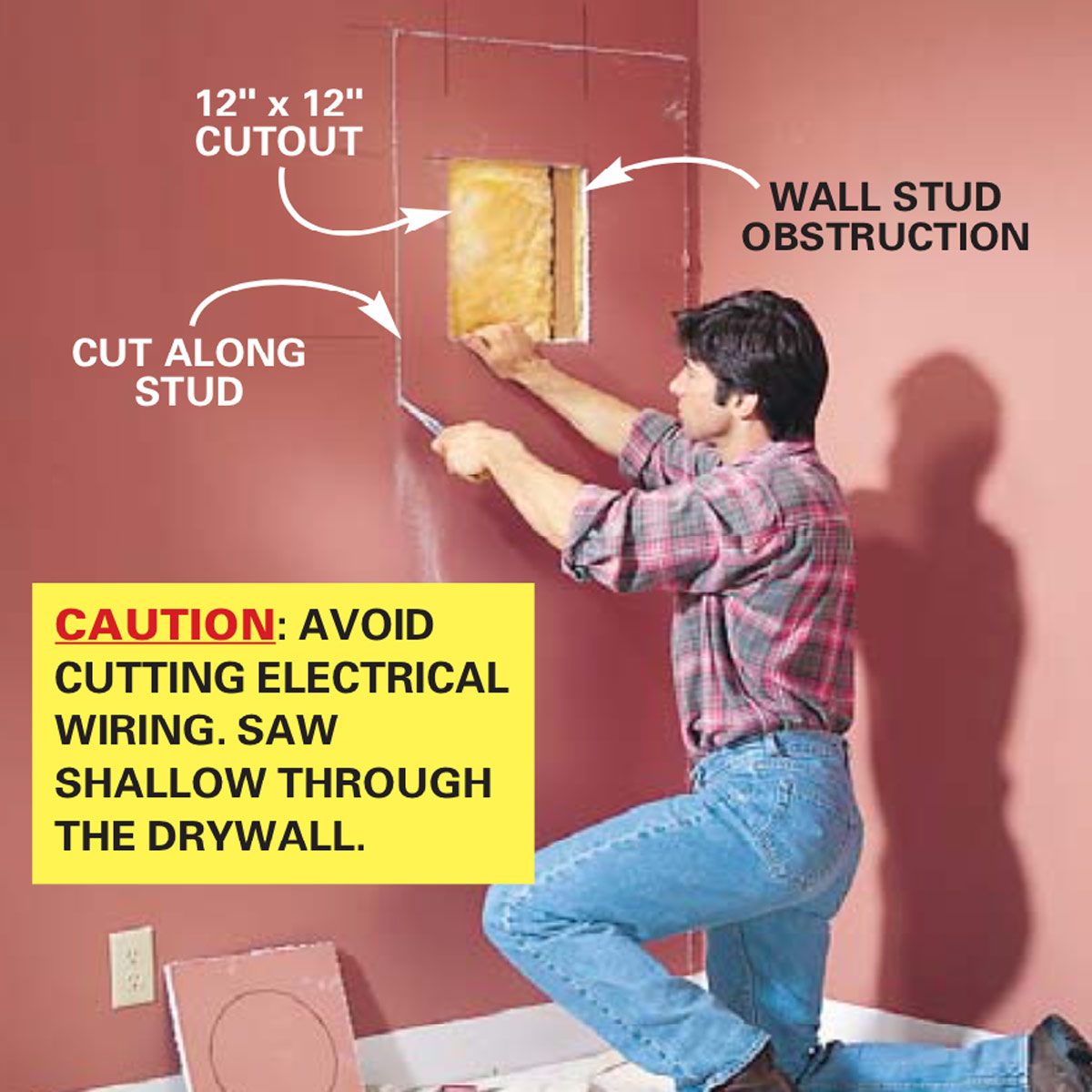 Caution: Keep the saw blade shallow to avoid cutting hidden electrical wires.