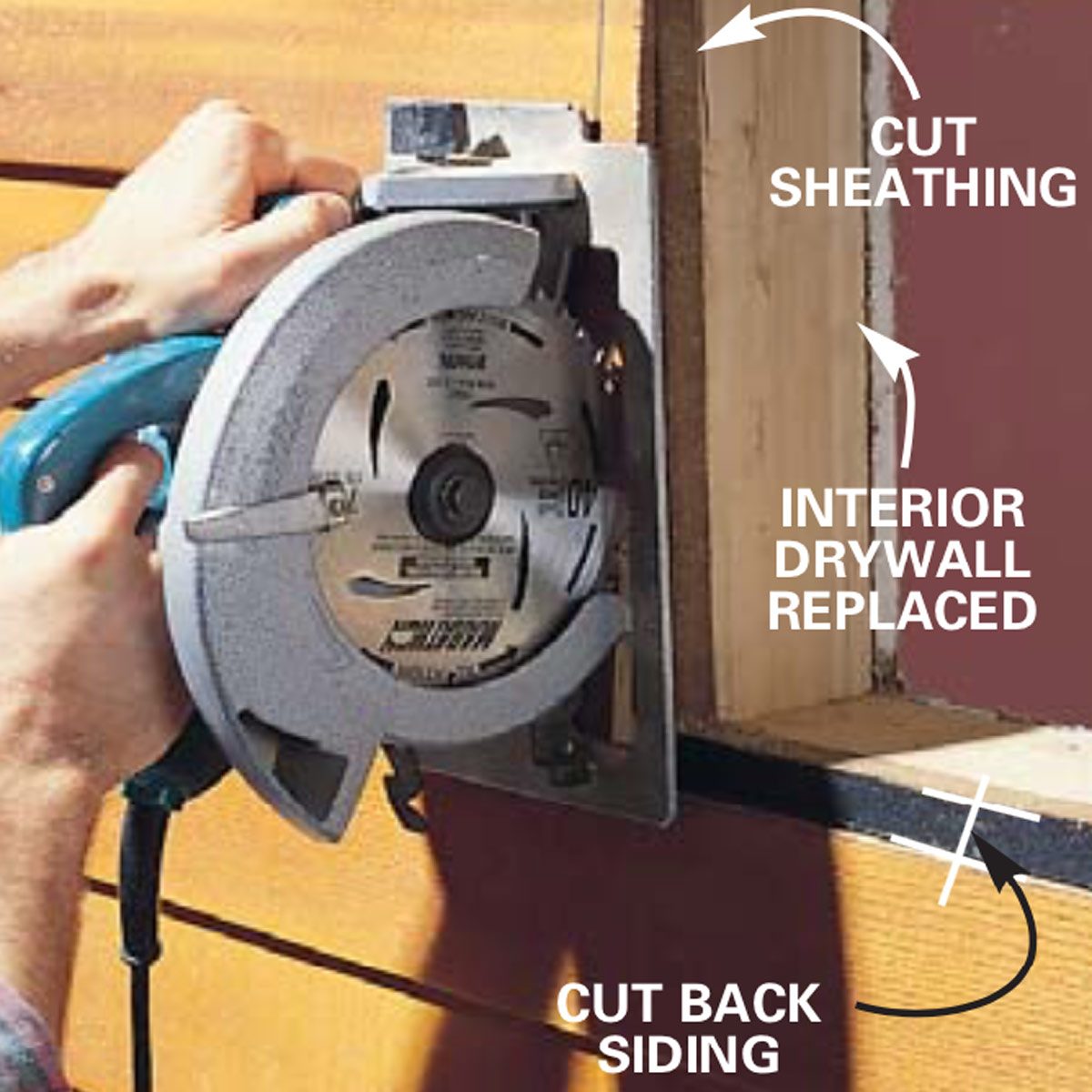 - Connect the four holes with lines and cut out the 12-in. opening in the siding and sheathing.