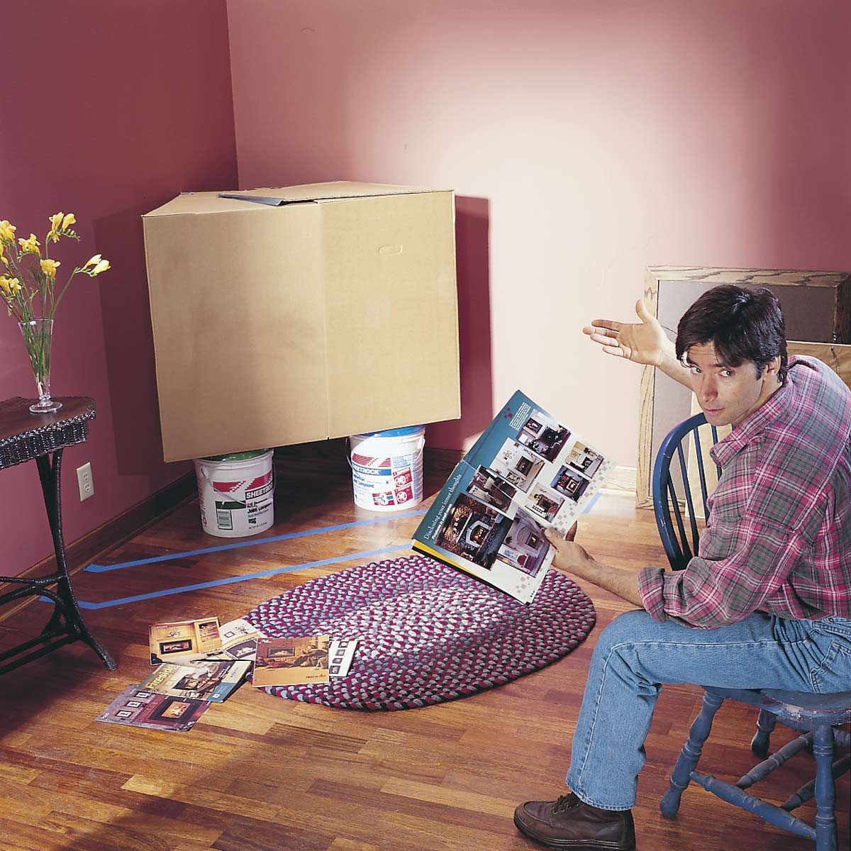 Mock up the fireplace using the dimensions given in fireplace brochures and outline the hearth shape with masking tape. Your new fireplace will have a major impact on your room. Build a simple mock-up to get a feel for the amount of space it takes up and to see how the angled placement will affect furniture arrangement and traffic patterns.