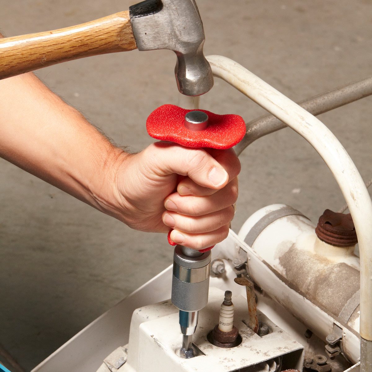 Hold the body of the impact driver to prevent it from turning. Then hit the end with a serious blow. If the screw still won’t budge and the surrounding surfaces can tolerate some heat, aim a lighter flame directly onto the screw head. Then douse it with cold water before trying it again. Still stuck? Invest in an impact screwdriver (photo 2). Pick one up for about $20 at a home center or an auto parts store.