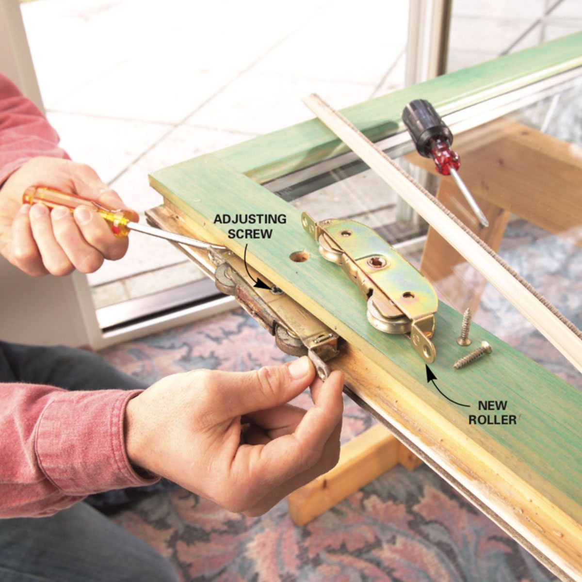 Tuning up a balky door for sliding glass door repair: Adjust rollers