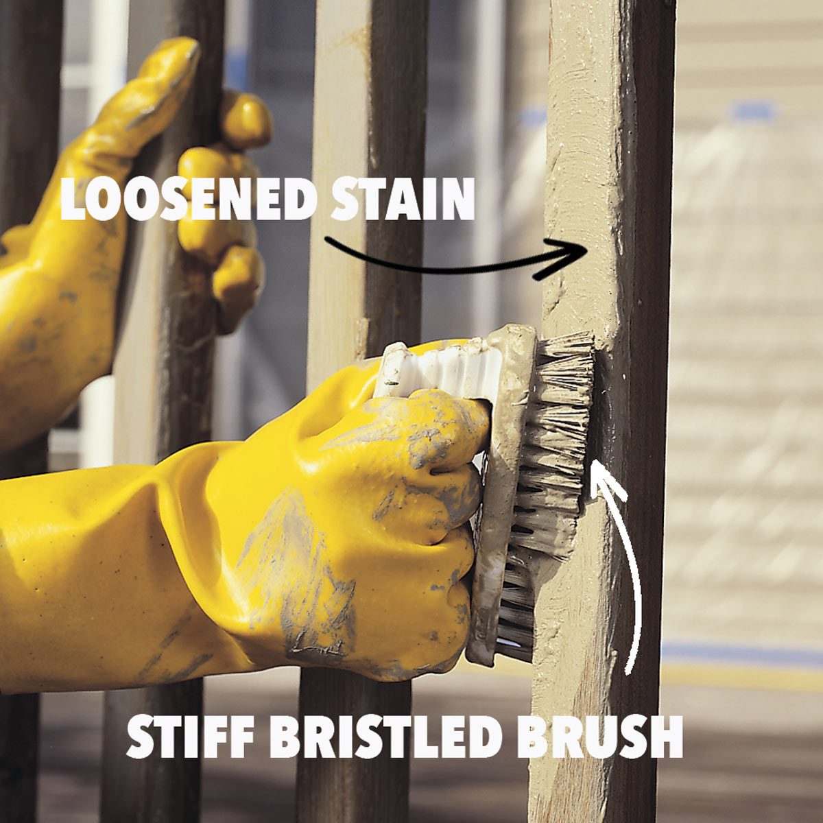 Both strippers and cleaners evaporate rapidly and become ineffective on hot, dry days. A cool, overcast day extends the working time of these solutions. Besides, you’ll want to make this messy job as comfortable as you can. This is hard work, so expect to sweat. You can work on the deck in sections (stripping railing sections) over several days if you don’t have an eight-hour block of time to do the whole deck.