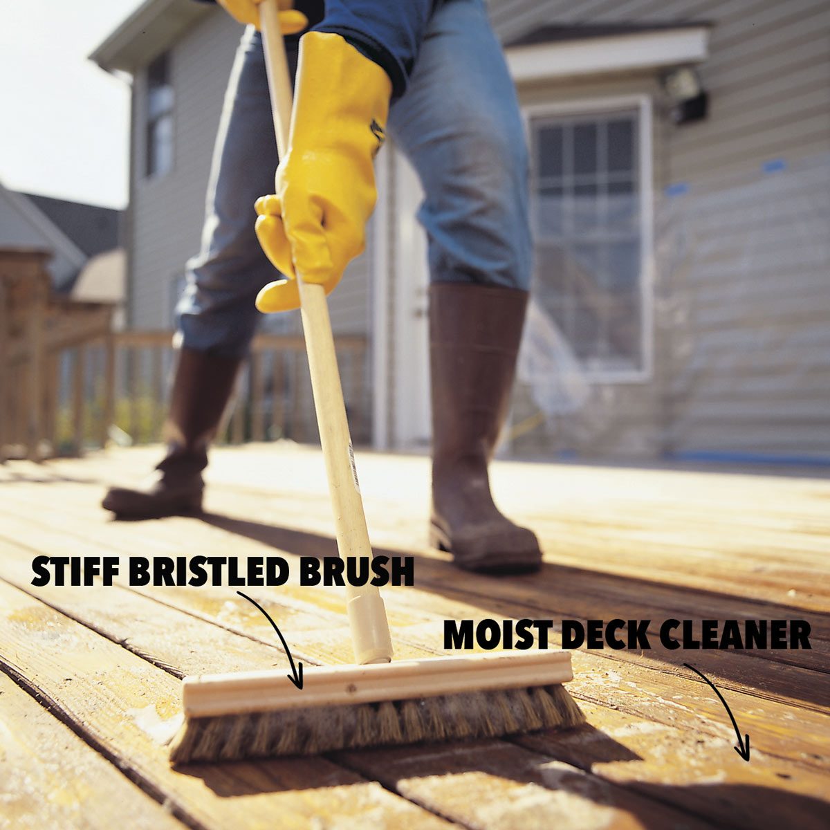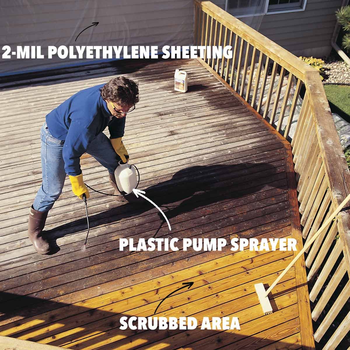 Cover your plants with plastic sheets once you’ve soaked them with water. Most strippers and deck cleaners won’t ruin your plants but can subject them to unnecessary stress. Even though this deck cleaning and staining project is low-tech, there are a few things you probably need to buy. Get rubber boots and rubber gloves. I like the gloves that cover up the forearms to protect against stripper that splatters and drips. Buy a paint applicator like the one shown in Photo 3 to apply stripper. I’ve tried brushes and rollers and this tool beats them all. You’ll also need a 1- or 2-gallon pump sprayer (buy one specifically for deck cleaners) and a hand-held stiff-bristle nylon scrub brush to scrub the stripper after you apply it. For scrubbing the deck surface, you can use a stiff brush (and I mean stiff!) with a pole handle like the one shown in Photo 7. Also wear safety glasses and old clothes because the stiff bristles of the scrubbing brushes can spit tiny droplets everywhere.