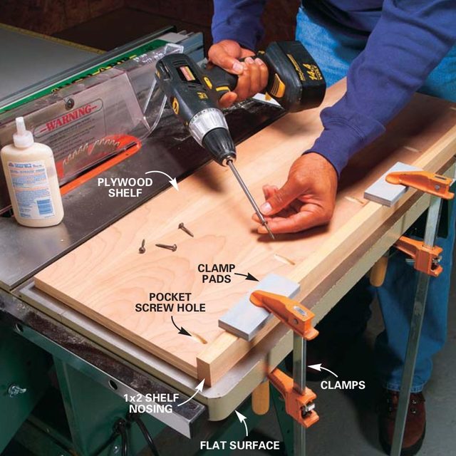 Drill pockets along the edge of the plywood shelf. Clamp shelf nosing to a perfectly flat surface like the table saw top shown here. Spread a thin layer of glue along the edge of the plywood and screw the plywood to the shelf nosing. The pocket screws will draw the plywood down, resulting in a flush joint when you flip the shelf over.