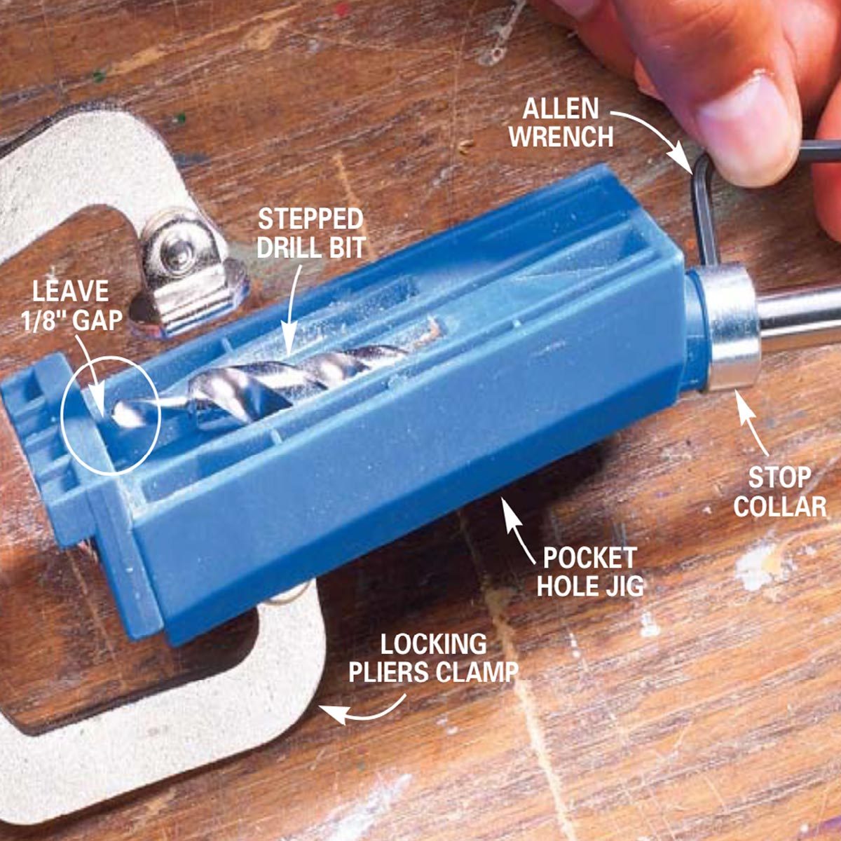 Buy a top-quality jig. Less-expensive jigs that lack built-in clamps or alignment guides aren’t worth messing with. The Kreg screws Rocket jig is a great mid-priced tool. The kit includes everything you’ll need to get started: a pocket hole jig, a special stepped drill bit and stop collar, a 6-in. driver bit, a locking pliers–type clamp and a handful of pocket screws. Buy Kreg screws jigs at woodworking stores or on-line, or shop for a high-quality pocket hole jig with similar features.