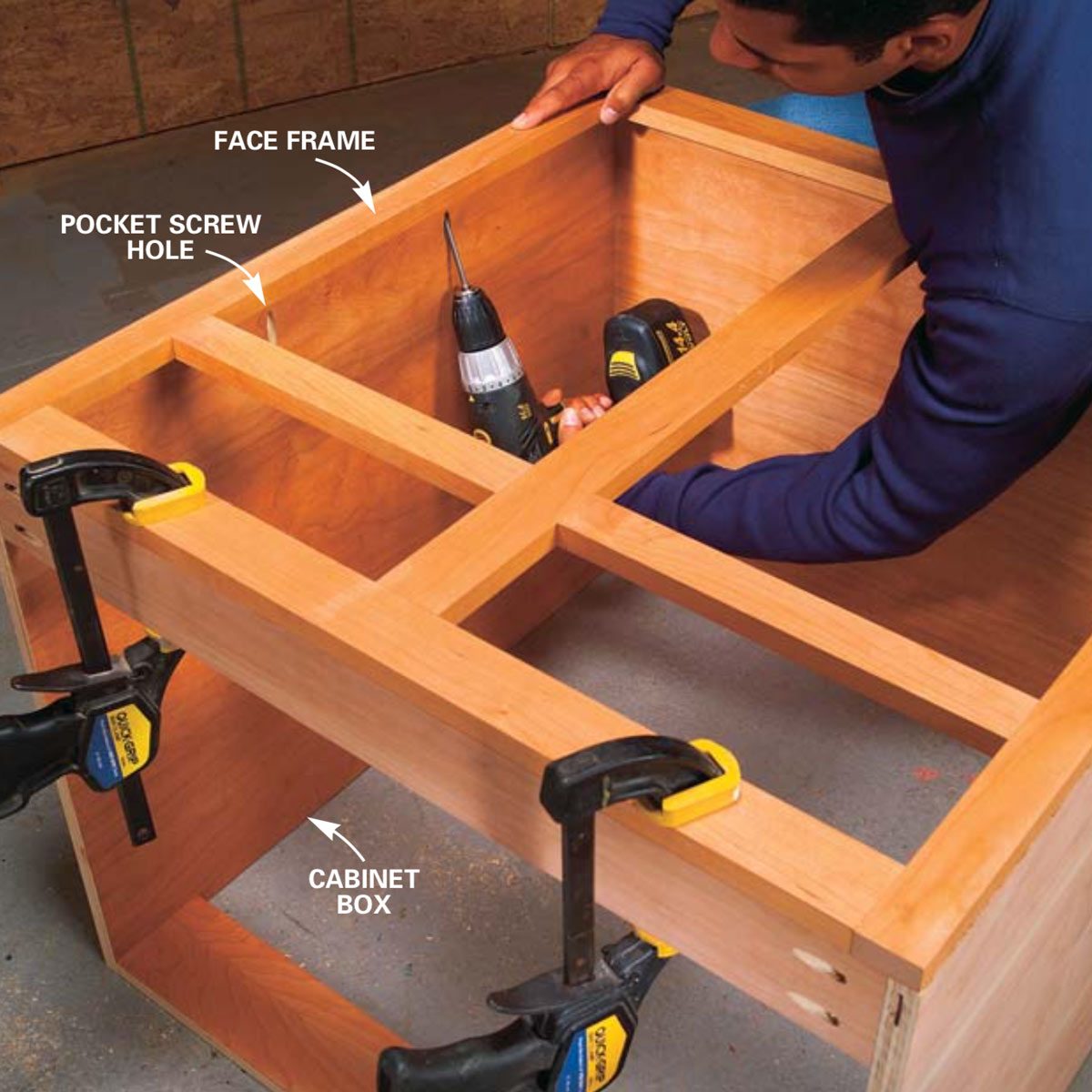 Assemble cabinet boxes with pocket screws by using the jig and drilling pocket holes every 8 to 12 in. along the edge of the plywood. Then glue, align and clamp the parts and screw them together. For a neater appearance, buy custom-shaped wood plugs to fill the pocket holes.