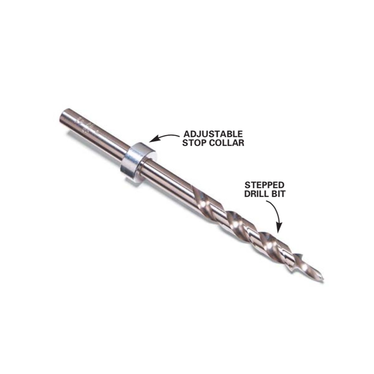 The pocket screw drill bit is stepped to simultaneously drill two different diameter holes. The stop color is the depth adjustment.