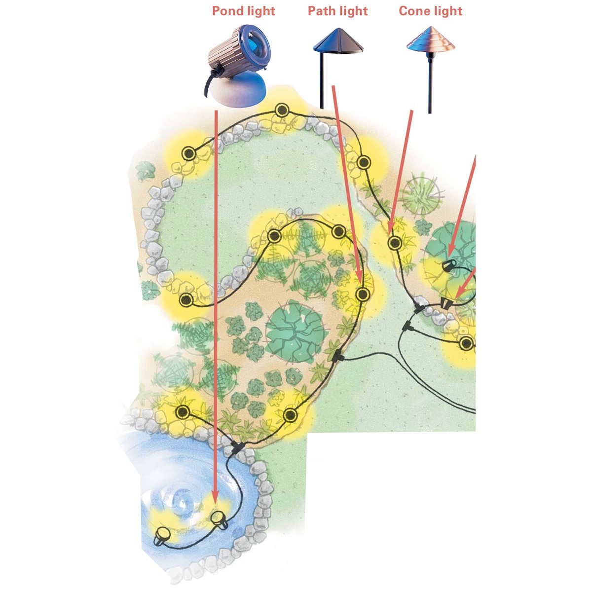 Pond lights are watertight and held in place on the pond bottom by a weighted base. They also have a long cord so you can bury your wire connections in the drier dirt at the pond’s edge. To get an idea of the pond light effect, see the opening photo. Pro tips for better design, layout and installation of low voltage lighting: Take the time to install your lights correctly and they’ll last longer, cast more light where you want it and require less maintenance. Get a first-class installation using these tips: