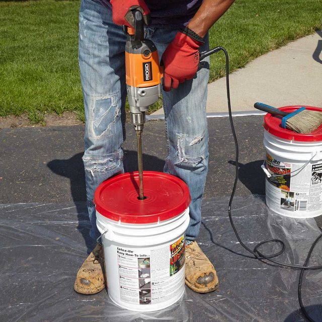 Start the mixing paddle near the top of the pail and slowly lower it into the contents settled at the bottom. Cycle the mixing paddle up and down while it spins to combine the water and solids into a smooth consistency. Choose an area on the driveway for mixing and cover it with poly sheeting to protect against spills (dried spills will show through the sealer). Remove the pail lids and cut a small hole in the center of one lid. Use that lid to prevent splashing during mixing. Stir until the mixture is smooth (Photo 4).