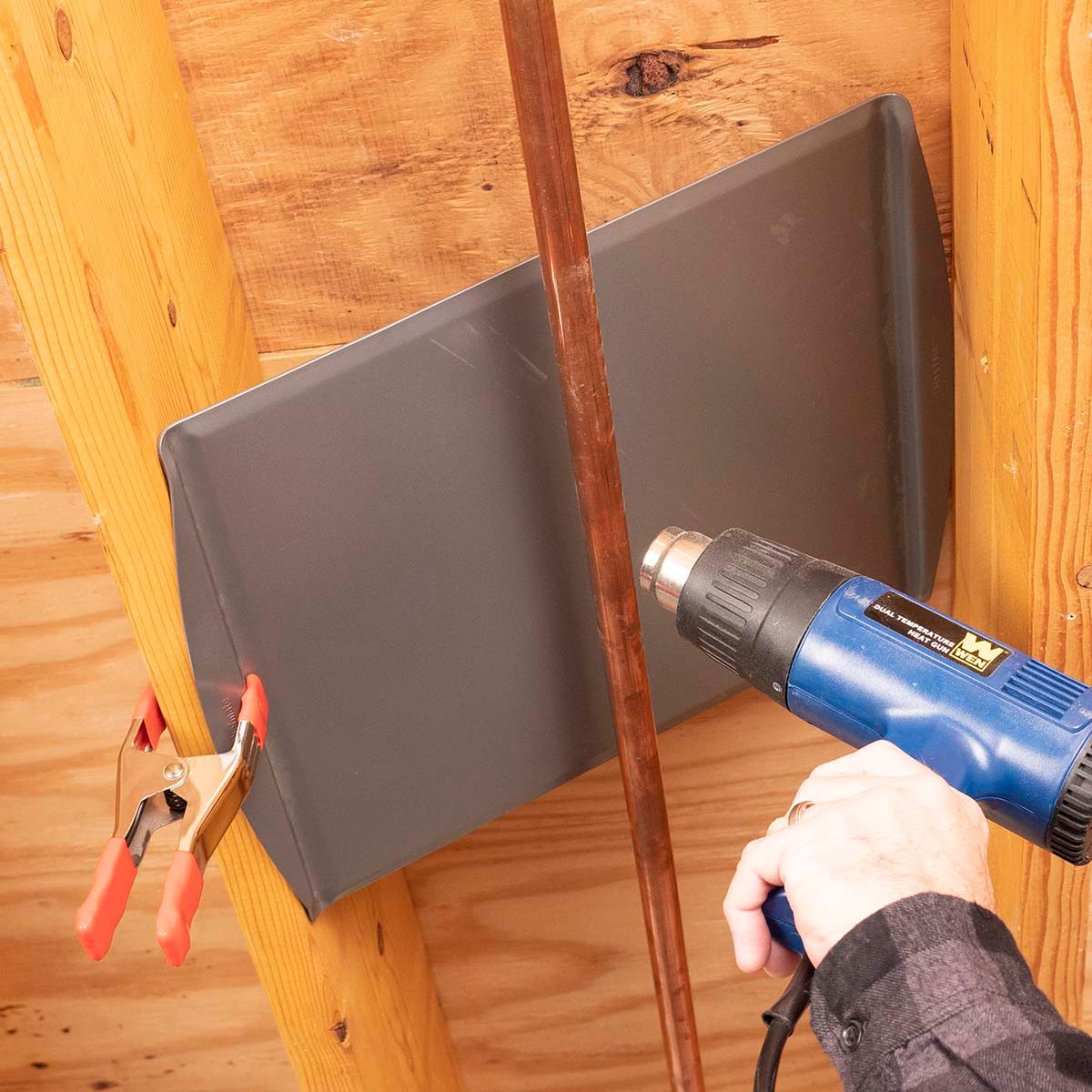 - Use a piece of sheet metal or aluminum foil behind the pipe as a heat deflector to keep the heat contained in the frozen area. A cookie sheet works well for this, too.