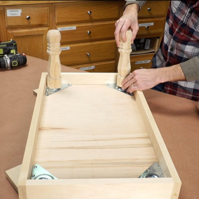 - Place the leg hardware in the corners, drill pilot holes and screw them into place.